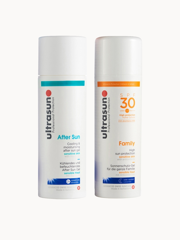 Comforting care for sun-exposed skin, this suncare duo protects, soothes and restores. With high-performance yet gentle formulas suitable for sensitive skin, it pairs all-day UV defence with a refreshing after-sun treatment to visibly calm and hydrate. Set Contents: Ultrasun Family SPF 30 Super Sensitive 150ml This velvety cream wraps the skin in comfort, creating a weightless veil of protection that visibly soothes and protects. Ultrasun Aftersun 150ml Deliver instant soothing hydration, the silky aftersun glides over sun-exposed skin, helping to reduce visible redness, moisturise dryness, and provide a cooling effect.