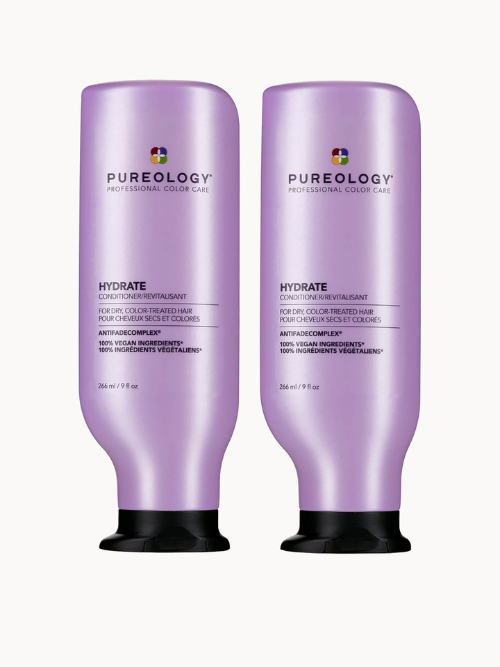 Quench the hair’s thirst with Pureology’s Hydrate Conditioner Duo, a set that deeply nourishes dry, colour-treated hair. The gentle conditioner plumps the strands with intense moisture, working to defend against dryness and visibly smooth the lengths.Pureology’s exclusive AntiFade Complex helps to protect colour vibrancy, while advanced micro-emulsion technology promotes a lustrous, full-bodied finish. Jojoba works in harmony with sage and tea tree extract to help condition and leave the strands feeling stronger. Complete with a mint and menthol fragrance, the treatment encourages a silky, glossy-looking finish.Vegan formula**Every formula is made without animal products or by-products.Set Contents:Hydrate Conditioner 2 x 266ml