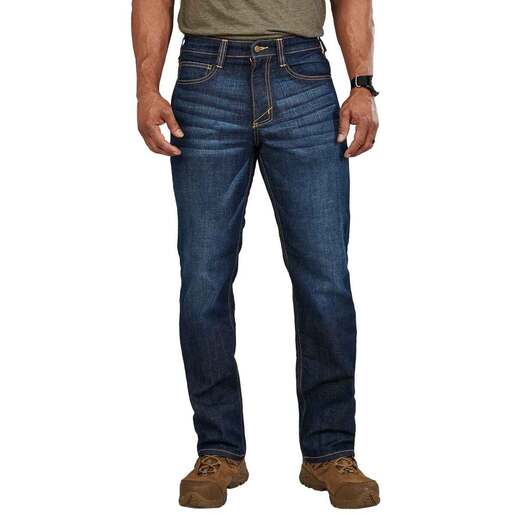 5.11 Men's Defender Flex Straight Fit Tactical Jeans - Whether it’s a weekend in the backcountry or a night out on the town, the Defender-Flex Straight Jean rolls with you. 10 oz. mechanical stretch denim (76% Cotton/24% Polyester with Lycra® T400 Tough Max™) Rinse Wash Indigo or Dark Wash Indigo Button top fly with locking YKK® zipper Dual back patch pockets Five pocket styling plus two rear hip pockets Double needle construction with bar tacks in high-stress areas Fitted waistband GSA/TAA compliant Straight fit Style: 74477