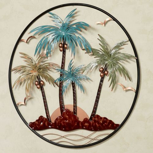 Allow your thoughts to soar away to Sunset Paradise and into this beautiful tropical scene. In a hand-finished, dimensional design, the metal wall art features a copper sun sinking behind the waves, island, seagulls, and palm trees finished with...
