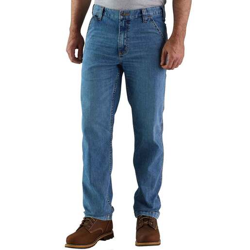 Carhartt Men's Rugged Flex Relaxed Fit Utility Jeans - Double shifts or 14-hour days. These men's jeans can stand up to almost anything. 85% Cotton/14% Polyester/1% Spandex denim Built to move with Rugged Flex stretch technology More room to move with comfortable fit through the seat and thigh and a straight leg opening Multiple tool and utility pockets Strong sewn-on-seam belt loops Style: 102808
