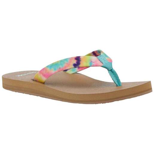 Sanuk Women's Ashland ST Tie Dye Flip Flops - A brand-new vegan sandal made for sunny days and journeys to your happy place. Tie dye print Polyester blend upper High rebound soft top foam footbed EVA midsole 47% recycled EVA foam 6% straw and 47% virgin rubber outsole Happy U tread 100% GRS-certified RPET Sanuk flag woven label Vegan, recycled materials Style: 1126891