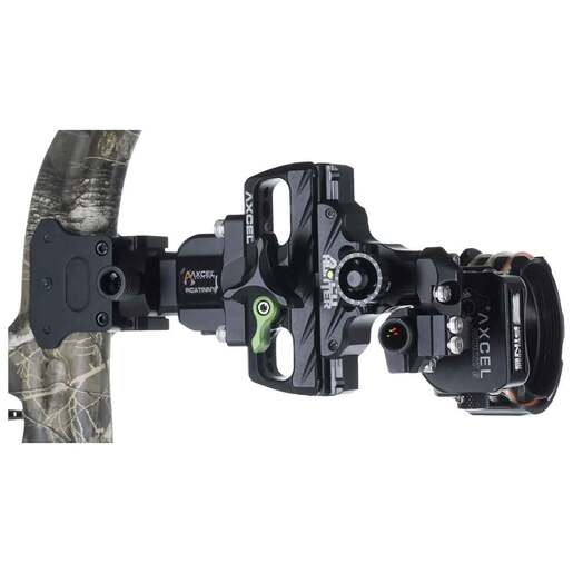 Axcel Accuhunter Picatinny 5 Pin Bow Sight - Slider sight with rapid adjust knob and quick release that slides the sight up and down along precision made, whisper quiet gear teeth for precise fine tuned yardage settings. An adjustable 20 yard dead stop helps you dial back to 20, 30, 40 yards in seconds while the 45 degree rear facing sight tape helps keeping your bow arm extended for minimal movement. True first, second and third axis adjustments are top quality. Features a push button windage lock ensures no sight adjustments without you knowing it. Green accents include the elevation lock lever, the pointer, and the windage lock. Comes with AV Hunter scope has a 1 3/4in or 41MM inside diameter. Fire pin equipped tough CNC machined pins and a new method of fiber wrapping technology, creating one of the brightest fiber optic pins. The Picatinny in-line sight mounts your sight to the front of your bow for better balance and create a super strong and durable connection so functional is the ability to adjust the sight in or out to one of three positions to match the peep sight to the scope housing or up or down to one of three positions on the bow riser for enhanced elevation adjustments. Adjustments with each picatinny connection can be done with one screw and snugged down slightly with a hex key wrench.