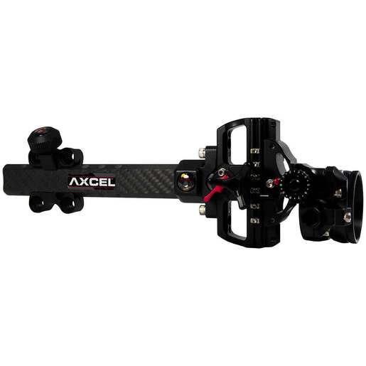 Axcel Accutouch Carbon Pro AV-41 1 Pin Bow Sight - Single pin adjustable sight features Accu-Click system which allows the shooter to set “clicks” at desired distances. As the sight elevation is adjusted, it will stop at those specified distances. A 45 degree facing sight tape makes it easier for the shooter to see where the yardage indicator is set. 1st, 2nd, and 3rd axis adjustments can be made without the use of shims. Micro adjust windage is locked into place until the Windage Lock Button is disengaged. Single pin adjustable sight Accu-Click system for setting "clicks" at specified distances 45 degree sight tape 1st, 2nd, and 3rd Axis adjustable Includes Axcel AV-41 scope
