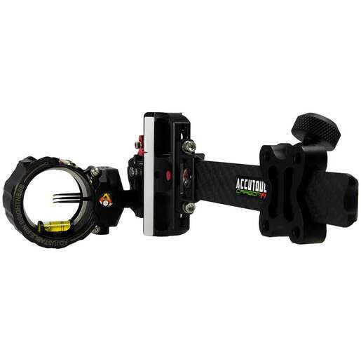 Axcel Accutouch Carbon Pro Accustat 3 Pin Bow Sight - Adjustable sight features a lightweight carbon dovetail bar and Accu-Click system which allows the shooter to set “clicks” at desired distances. As the sight elevation is adjusted, it will stop at those specified distances. A 45 degree facing sight tape makes it easier for the shooter to see where the yardage indicator is set. 1st, 2nd, and 3rd axis adjustments can be made without the use of shims. Micro adjust windage is locked into place until the Windage Lock Button is disengaged. Includes Accu-Stat scope with an adjustable rheostat fiber cover and micro adjustable pins. Multi-pin adjustable sight Accu-Click system for setting "clicks" at specified distances 45 degree sight tape 1st, 2nd, and 3rd Axis adjustable Accu-Stat scope with micro adjust pins
