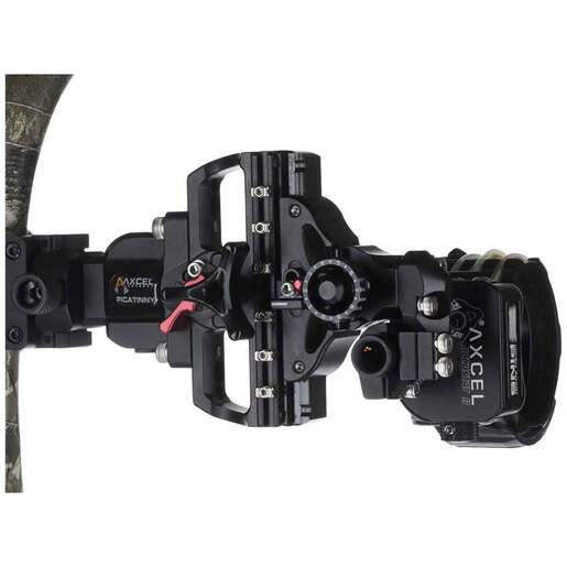 Axcel Accutouch Picatinny Accustat II 5 Pin Bow Sight - Slider sight allows to set each Accu-Click at a specific 20, 30, 40 yards so the slider stops where you want it. A 45 degree rear facing sight tape allows easy recognition of the sight pointer. Adjustable red elevation tension lever provides own personal choice of how easily the sight slides along the elevation bar. Features all axis leveling capabilities from the fire adjustments NO shims needed to the second and third axis leveling on the head of the scope adjustment. Push button windage lock when engaged does not allow the windage knob to turn. Superior windage dovetail guide system. Comes with Accustat 41MM 1 3/4in scope. Fire pin equipped tough CNC machined pins with a rheostat cover to dial down brightness. TCS connector instead of the 10-32 rod. Visible in line sight level. CCT aiming ring designed for greater accuracy when viewing off center. The Picatinny in-line sight mounts your sight to the front of your bow for better balance and create a super strong and durable connection so functional is the ability to adjust the sight in or out to one of three positions to match the peep sight to the scope housing or up or down to one of three positions on the bow riser for enhanced elevation adjustments. Adjustments with each picatinny connection can be done with one screw and snugged down slightly with a hex key wrench.
