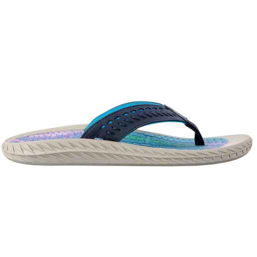 Korkers Women's Fish Flip Flops - An essential beach sandal made with cushioned, water-resistant sandal materials that will make your feet feel at home. Non-marking Kling-On Deck rubber outsole Double stack midsole design Anatomical molded footbed featuring Cush-Tech premium EVA Contoured arch provides stability and support Lightweight water resistant material Vibrant DeYoung art provides fun, fish inspired decorative detail Style: OF1500BE