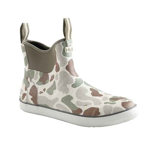 Huk Men's KC Print Rogue Wave Waterproof Pull On Boots - Sometimes, the best fishing is found in the worst conditions. Huk's Rogue Wave fishing boots are specifically designed for all-day comfort and engineered for optimal performance in any condition. These slip-on style boots are constructed of incredibly durable neoprene rubber for protection from the elements and reliable strength. Carefully designed with positive traction in wet conditions, Huk’s exclusive Grip-X Slice outsole traction pattern and microchannels ensure stable footing that grabs in all directions, no matter how slick the boat deck or dock may become. Breathable mesh liners help ensure the boots stay dry on the inside, keeping the wet on the outside. The comfortable rounded toe and non-marking outer sole help make the Huk Rogue Wave boots the right fit for wet weather. Grip-X Outsole Non-Marking Traction Pattern 8MM Molded EVA Footbed Commercial Grade Reinforced Webbing Pull-Straps For half-sizes, we recommend sizing up Neoprene and Rubber Upper Style: H8021037