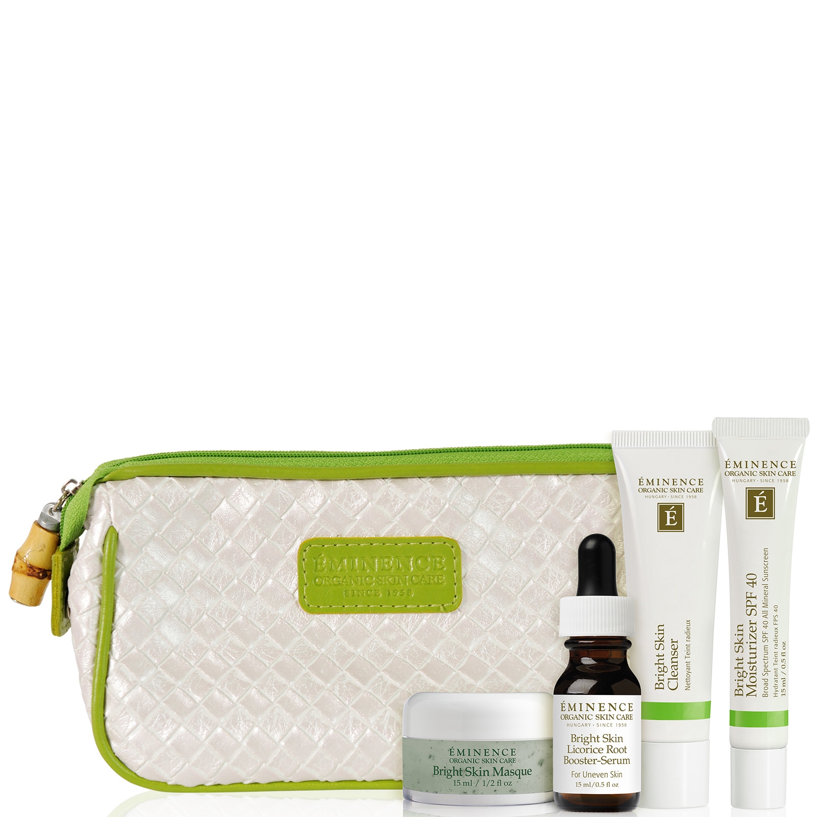 Eminence Bright Skin Starter Set is beautifully packaged with a one-month's supply of targeted organic products to treat uneven skin types. Starter Set Includes:Bright Skin Cleanser (1oz / 30 ml tube)Bright Skin Moisturizer (Broad Spectrum SPF 40) (0. 5 oz / 15 ml tube)Bright Skin Masque (0. 5 oz / 15 ml jar)Bright Skin Licorice Root Booster-Serum (0. 5oz / 15 ml bottle)One classic cosmetic bag in woven faux leather with bamboo zipper. Dermstore has partnered with Flex to allow you to use your Health Savings Account (HSA) or Flexible Spending Account (FSA). This means you can now use your HSA or FSA debit card to buy Eminence Organic Skin Care products with pre-tax dollars, resulting in net savings of 30-40%, depending on your tax bracket. Eligible for HSA/FSA with a letter of medical necessity at checkout. From dermatologist-recommended treatments to solutions for chronic skin conditions like acne, eczema, and rosacea, these products are both effective and eligible. | Eminence Organic Skin Care Bright Skin Starter Set | Dermstore