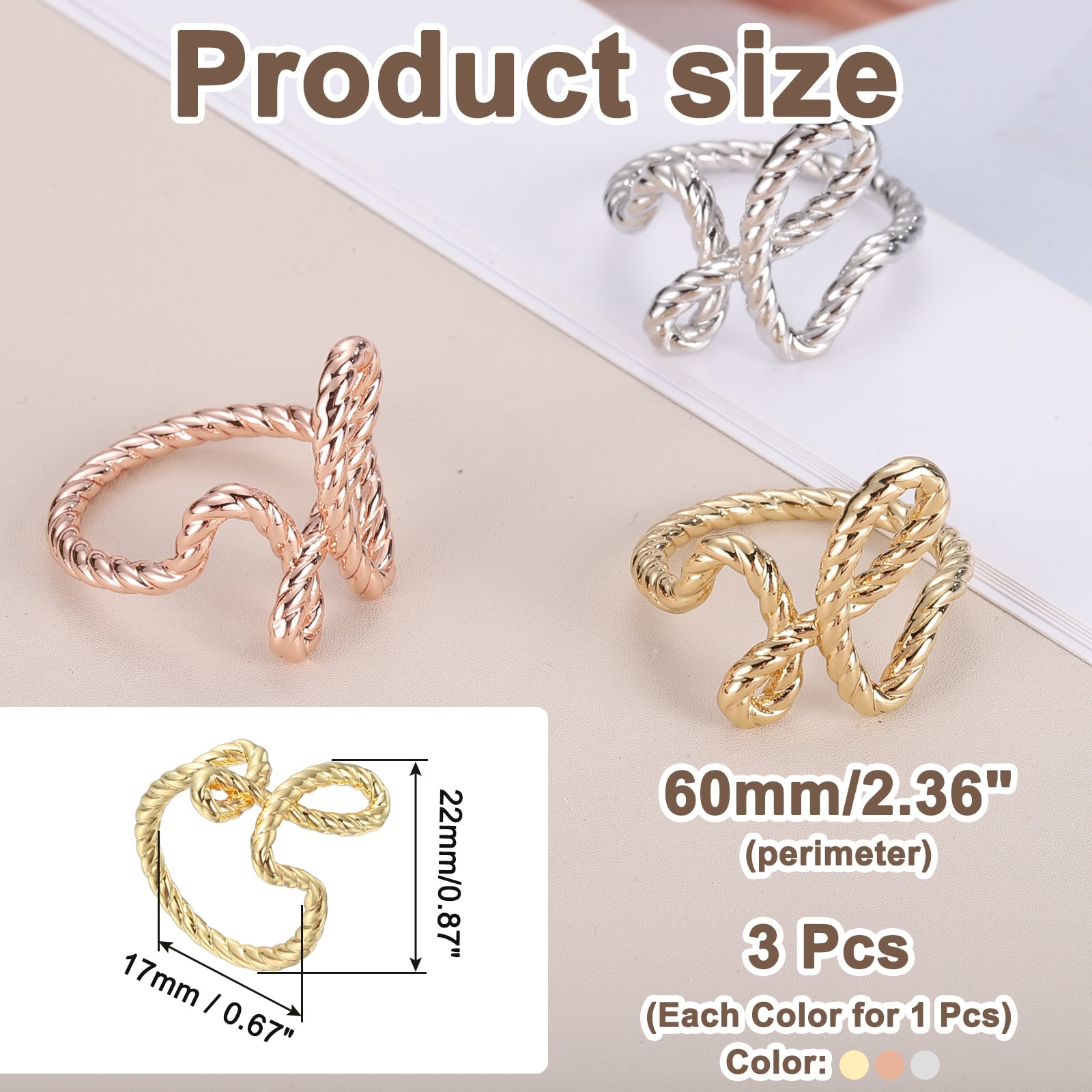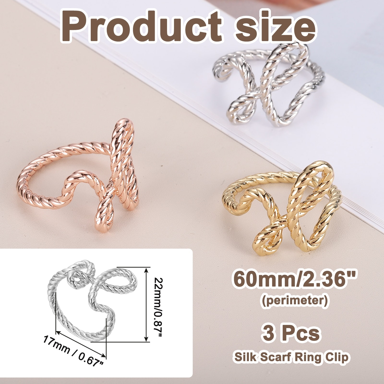 Silk Scarf Ring Clip, 3Pcs Twisted Rope Scarves Pin, Gold Tone