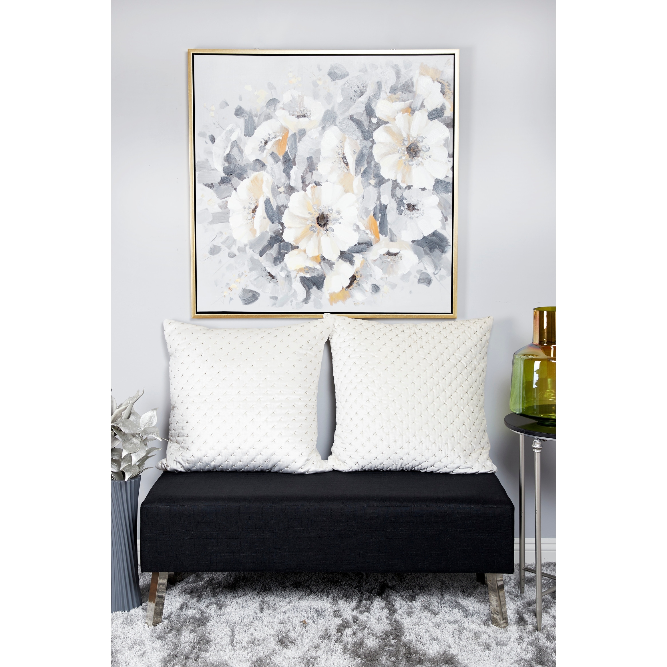 Large Square Gray Gold & White Flower Acrylic Painting in Gold Frame 39.5 x 39.5 - 40 x 2 x 40