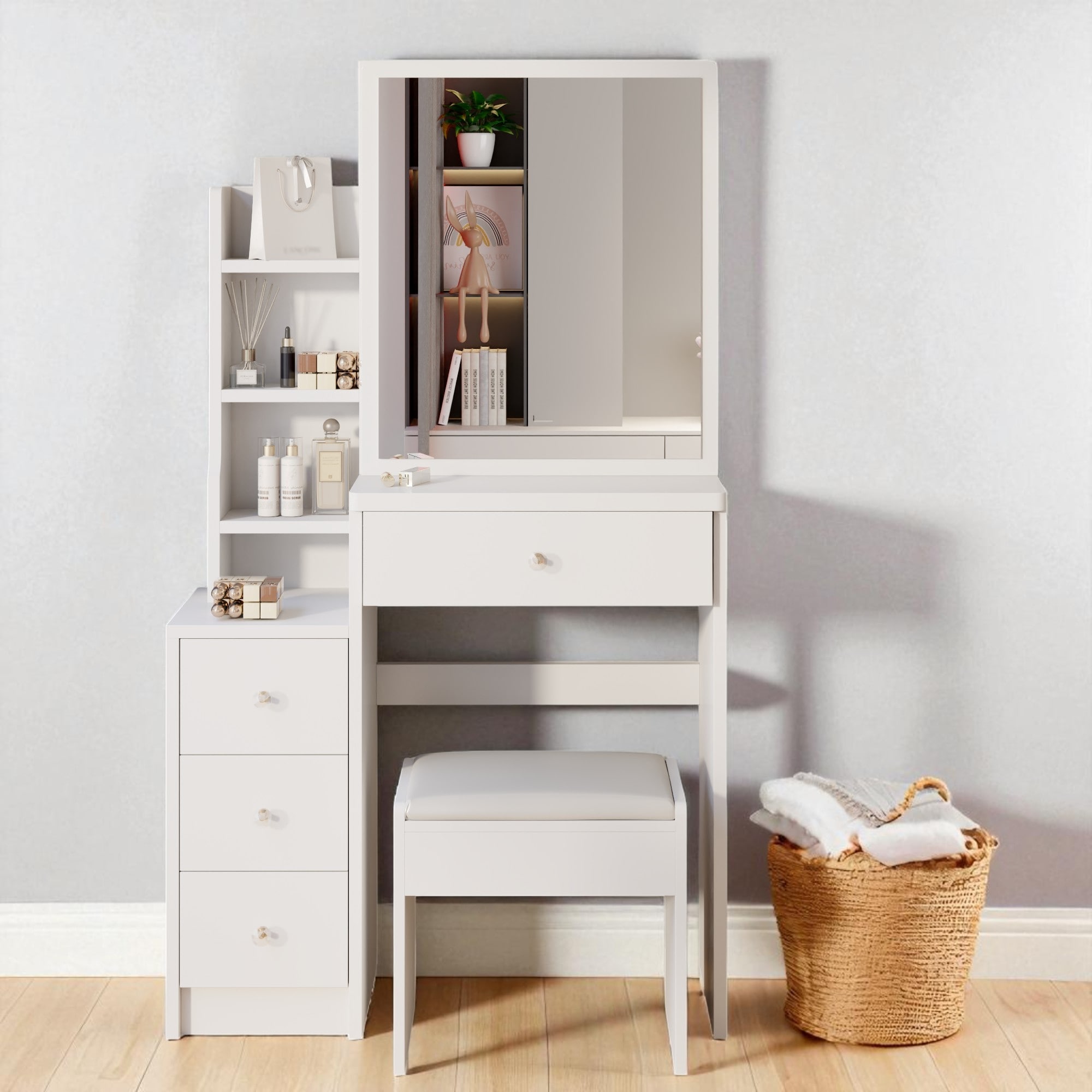29.2" Small Space Vanity Table with Sliding Mirror, Stool and Storage Cabinet, Compact Makeup Dresser