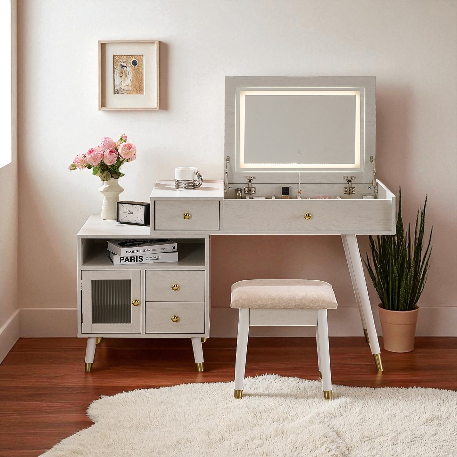 3-in-1 Vanity Desk with Flip-Top Mirror, LED Light, Adjustable Cabinet & Stool,Makeup Table with Storage Drawers.