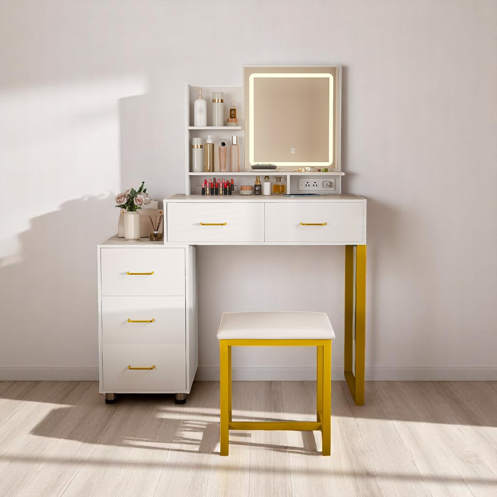 Makeup Vanity with LED Mirror, 3 Color Lights, Power Outlet, 5 Drawers, Metal Legs and Chair Set