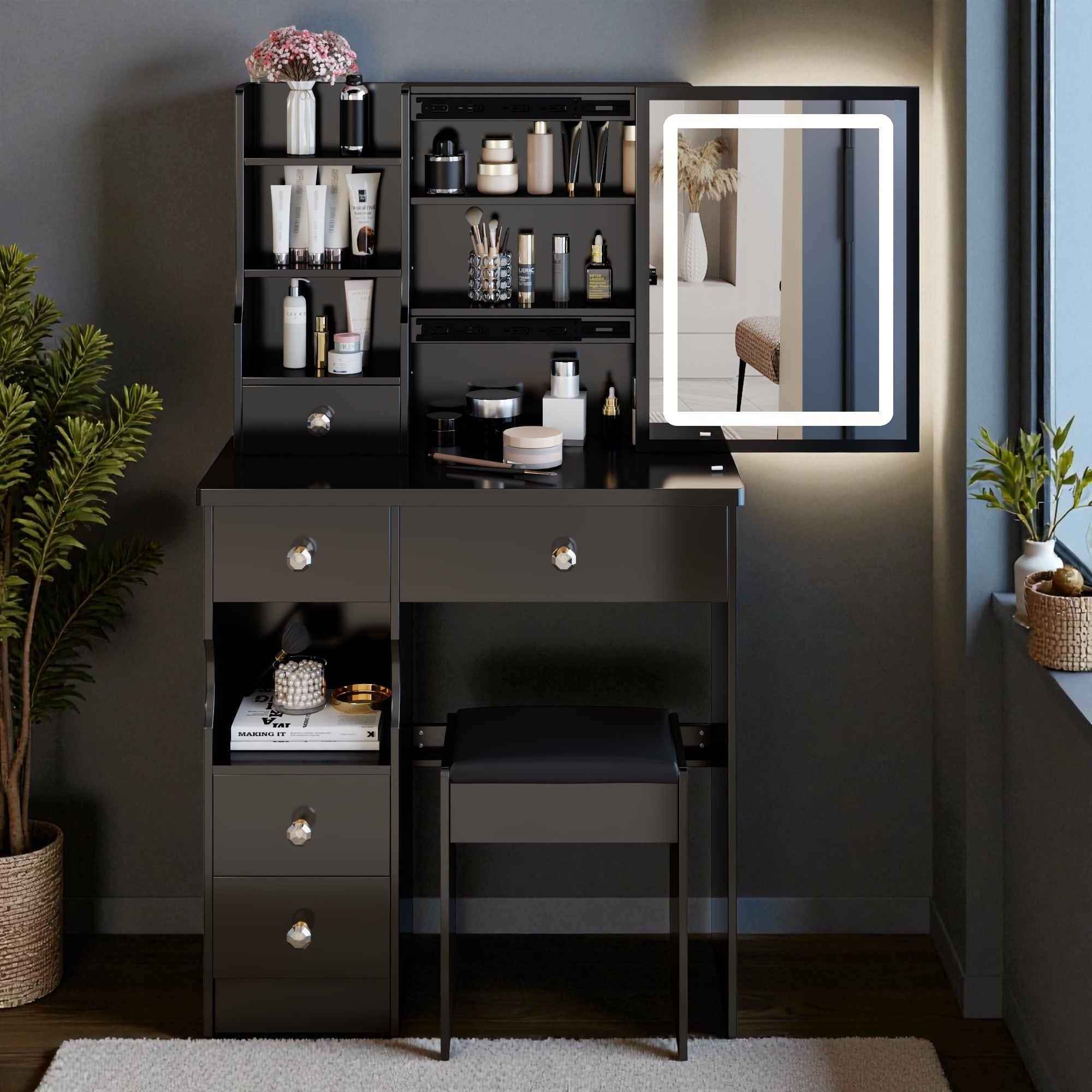 29.2" Small Vanity Table with Sliding LED Mirror, Touch Control, Tri-Color Dimming, Storage Shelves & Cushioned Stool