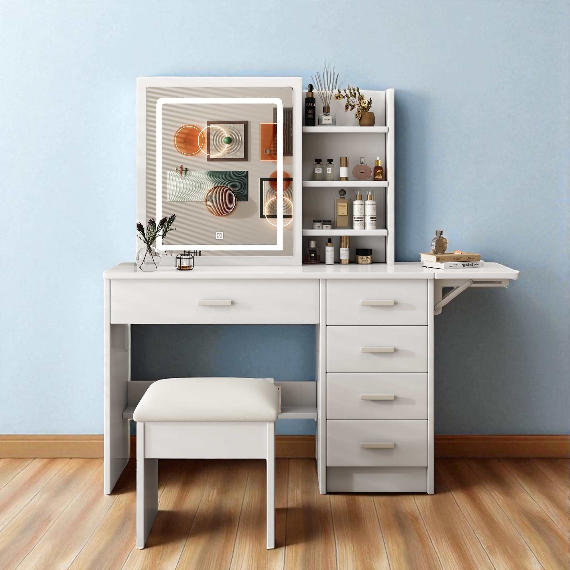 Vanity Desk with Mirror & LED Lights, 5 Drawers, Open Shelves & Chair, Makeup Table Set with Adjustable Lighting