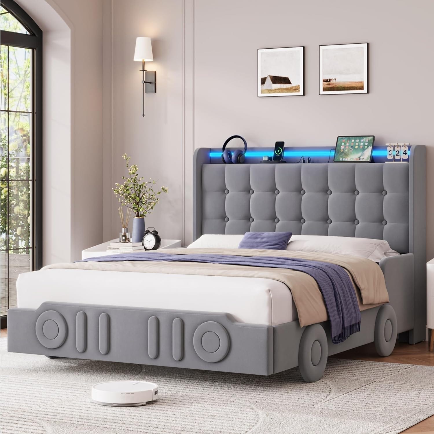 LED Illuminated Upholstered Car Bed Frame with Charging Station, Storage Shelf & RGB Lights, No Box Spring Needed - Velvet Grey