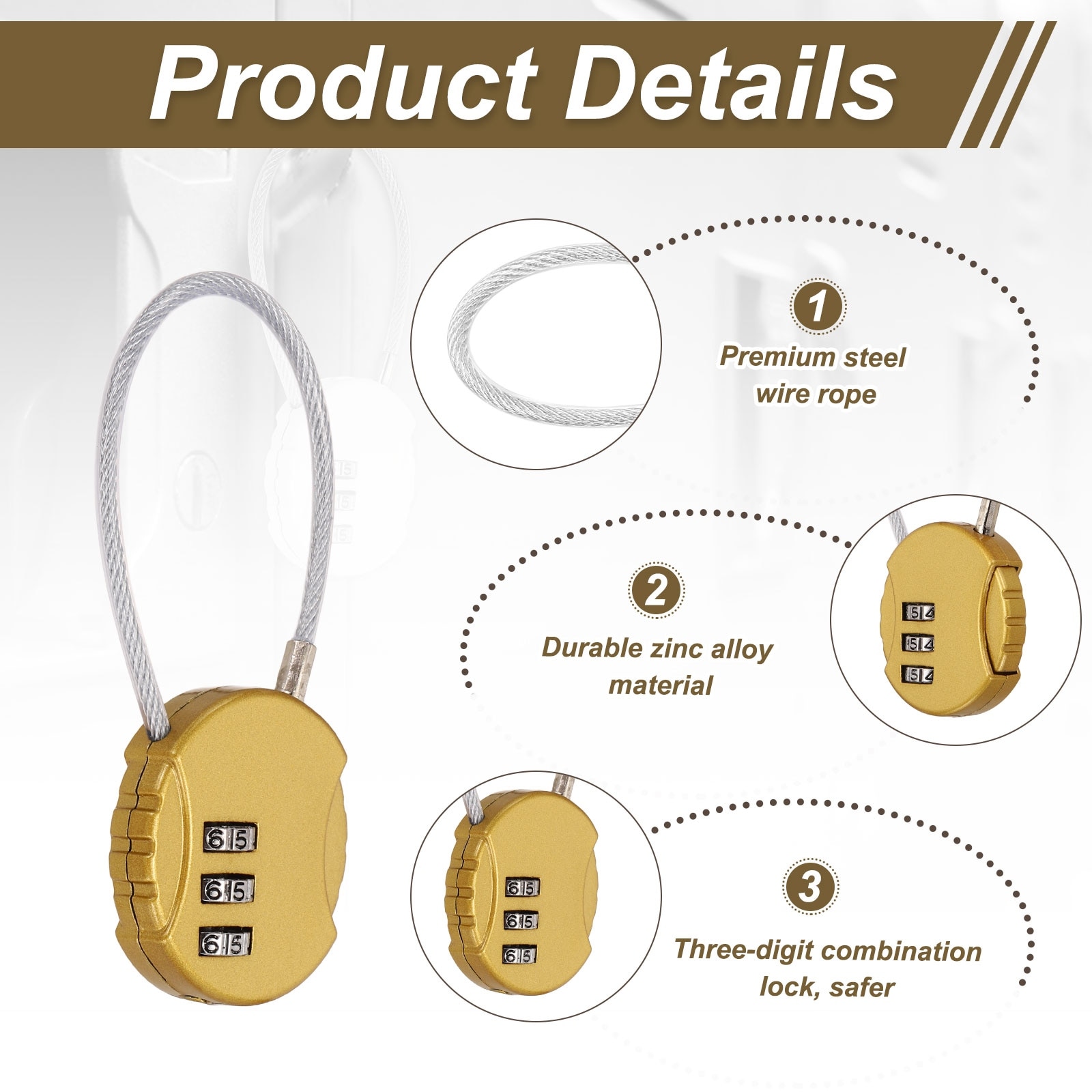 Pack Combination Padlock, Zinc Alloy 3 Digit Password Round Shaped Cable Luggage Combo Lock for Suitcase