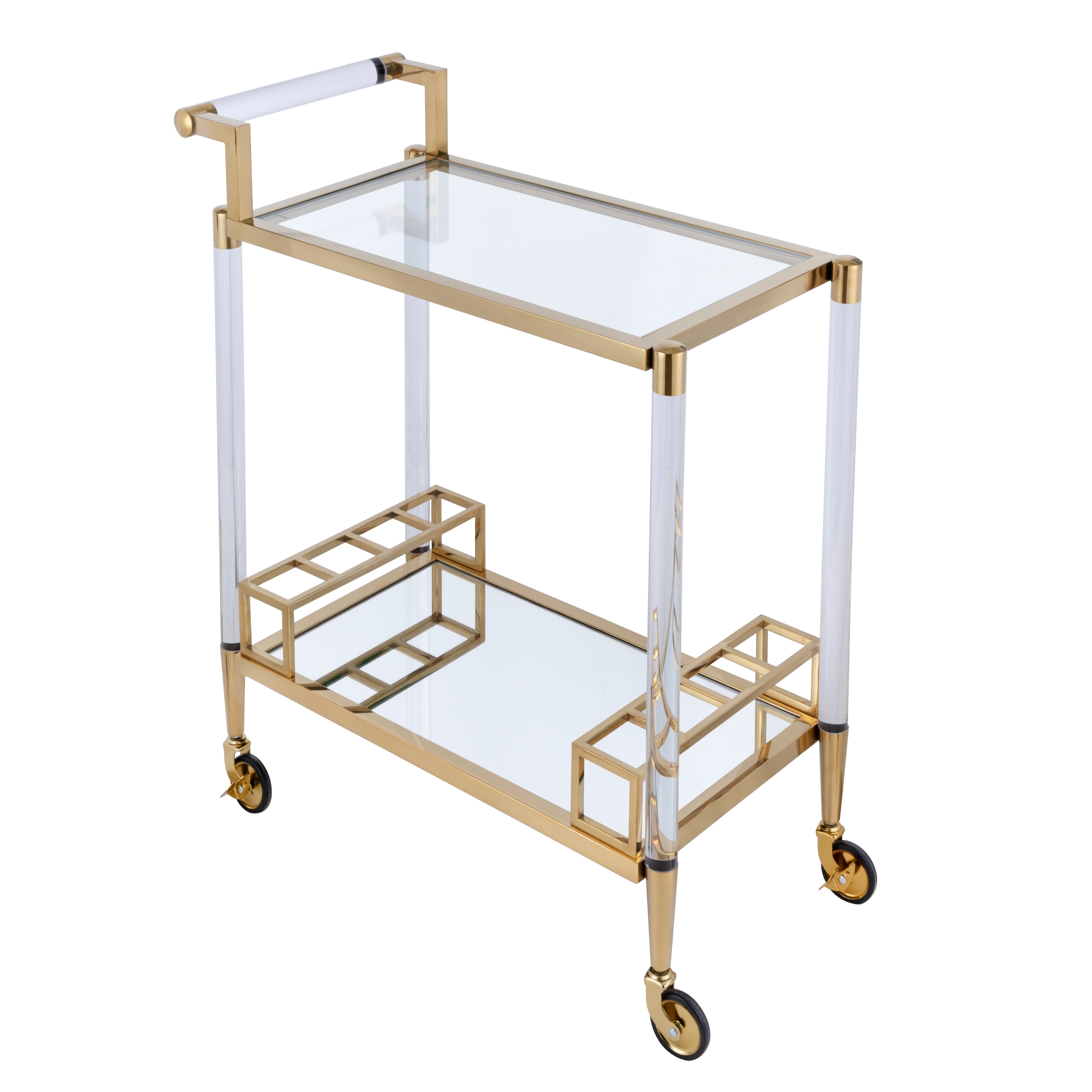 Pasargad Home Glacia Modern 2-Tier Lucite and Metal Bar Cart with Glass Shelves, Gold - W30.12"xD15.75"xH35.04"