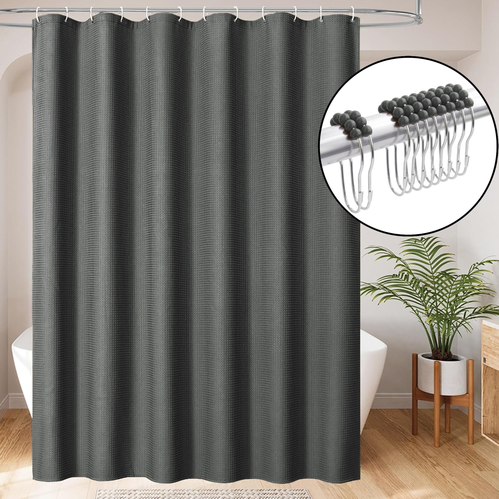 72" x 72" - Dark Grey Fabric Textured Glam luxury Shower Curtain With 12 Metal Roller Ball Hooks