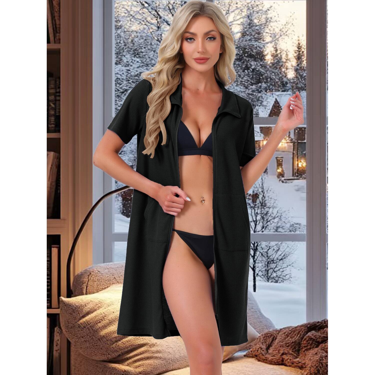 Women's Zipper Robes Waffle Short Sleeve Bathrobe Housecoat Lightweight Nightgown with Pockets