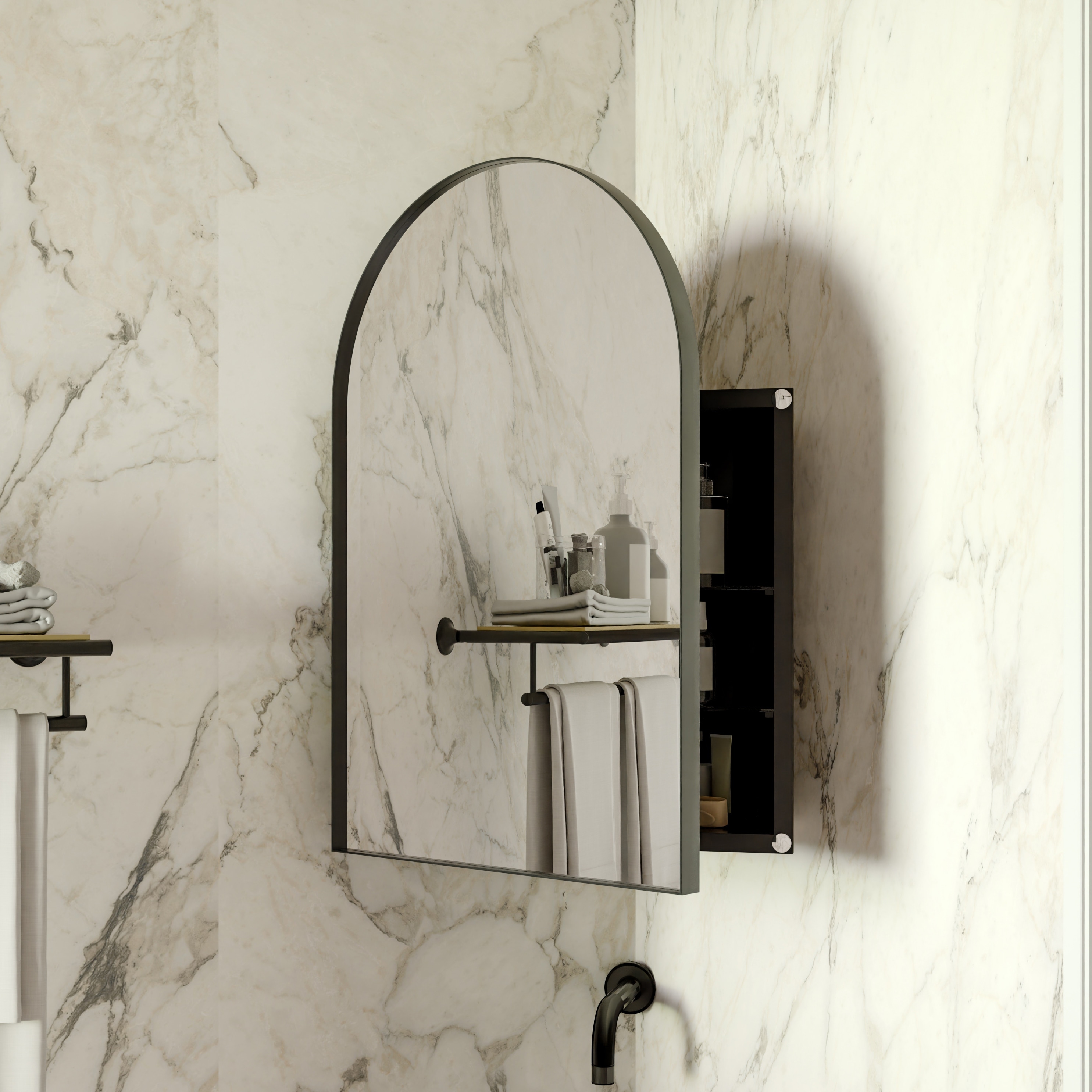 18x24 Inch Metal Corner Medicine Cabinet with Arched Mirror, Adjustable Glass Shelves, Space-Saving Bathroom Storage