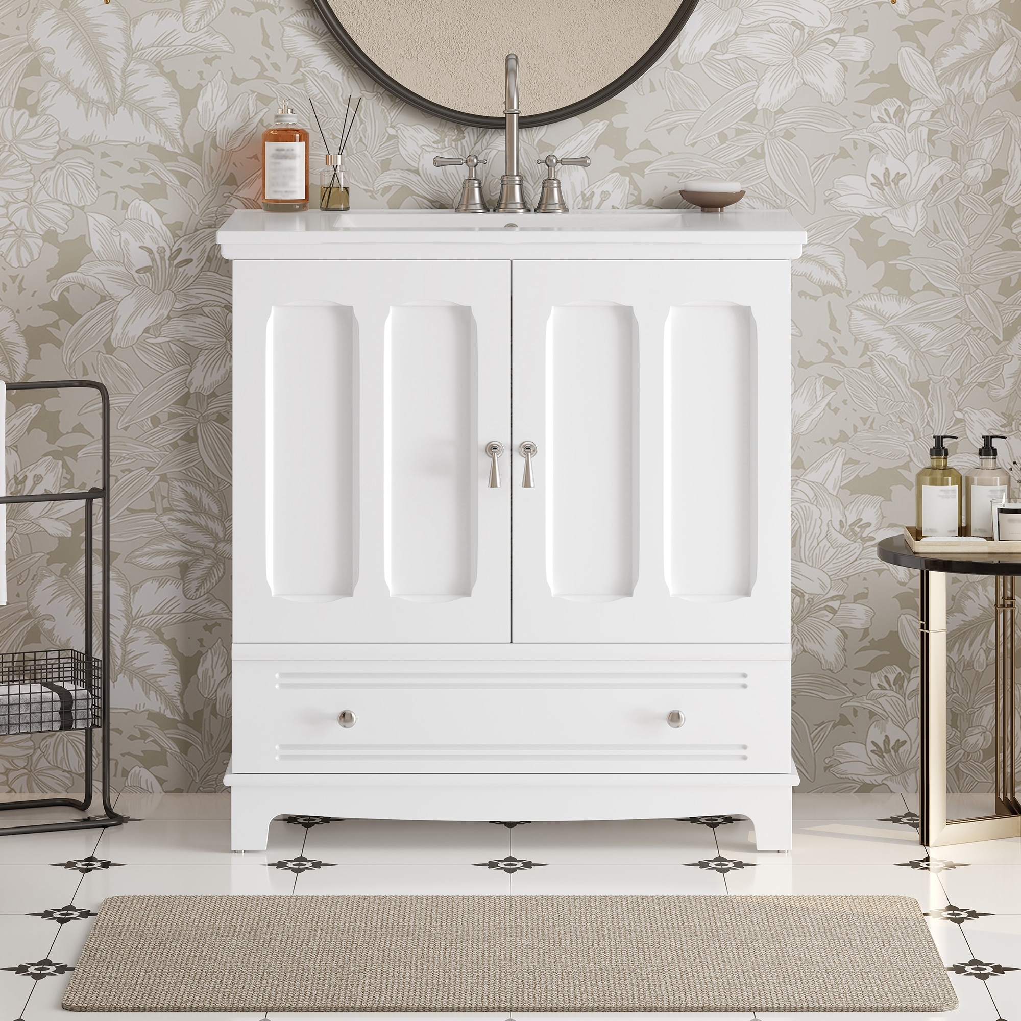 30" Solid Wood Bathroom Vanity with Ceramic Sink, Adjustable Shelf & Drawer Divider, Durable Sink Cabinet, Sturdy Feet