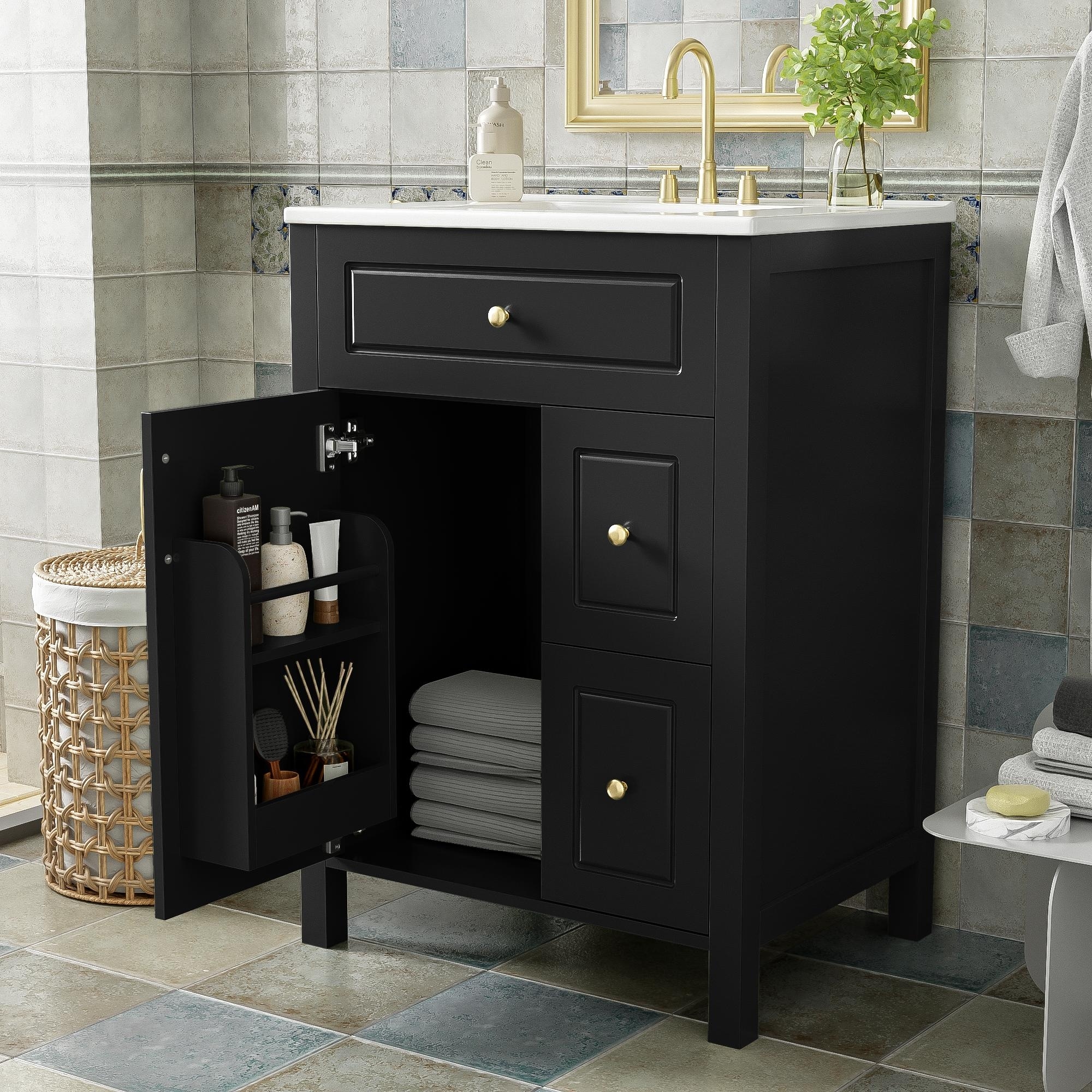 Modern 24-Inch Bathroom Vanity with Ceramic Sink, Solid Wood and MDF Cabinet with Flip Drawer, Drawers, and Adjustable Shelf