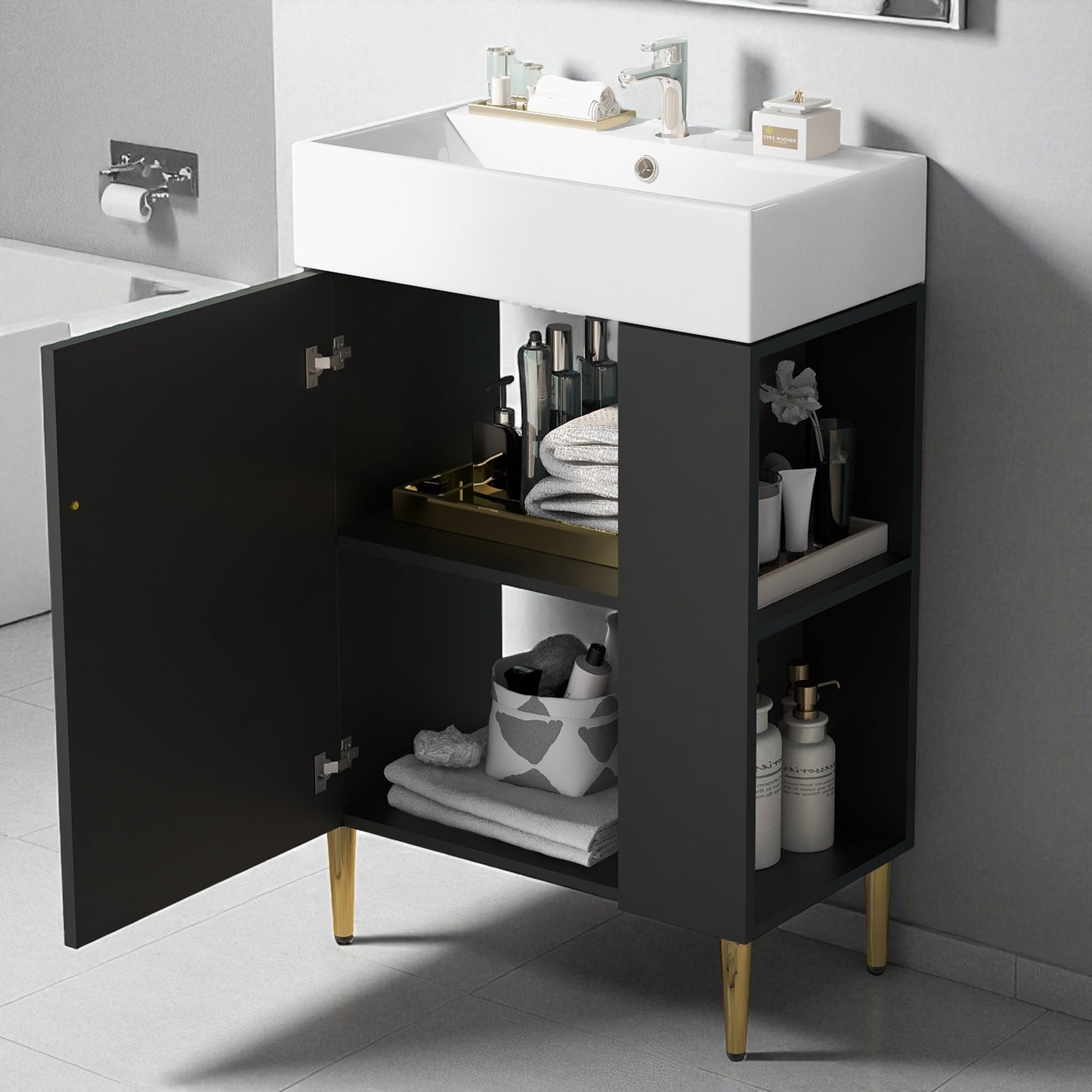 21.6 Inch Bathroom Vanity with Sink, Side Storage Cabinet, Soft Close Door, Freestanding with Ceramic Basin