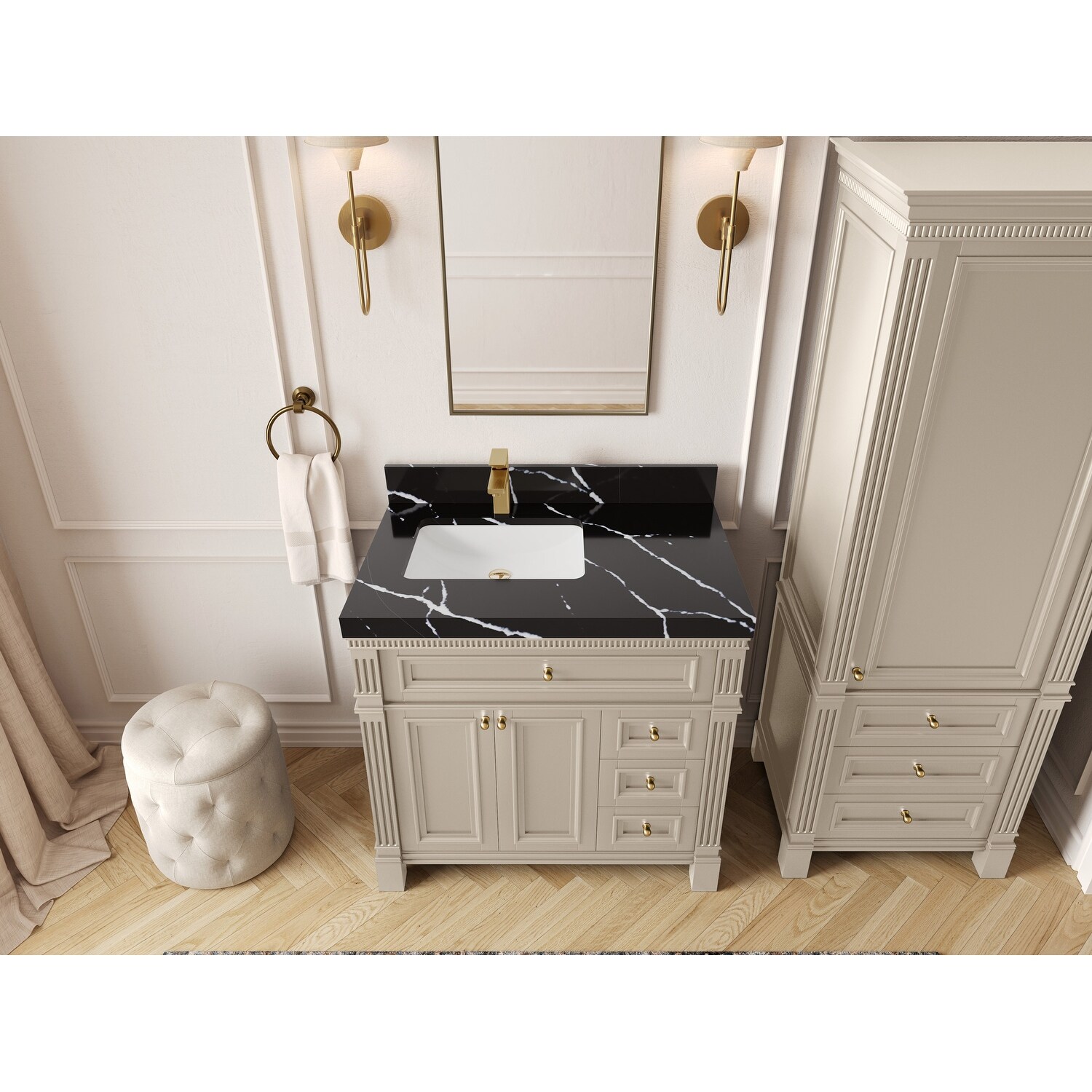 36" Bathroom Vanity&Sink, Freestanding Striped Plywood Cabinet (Drawer+Open Shelf), Sintered Stone Top&Undermount Ceramic Basin"