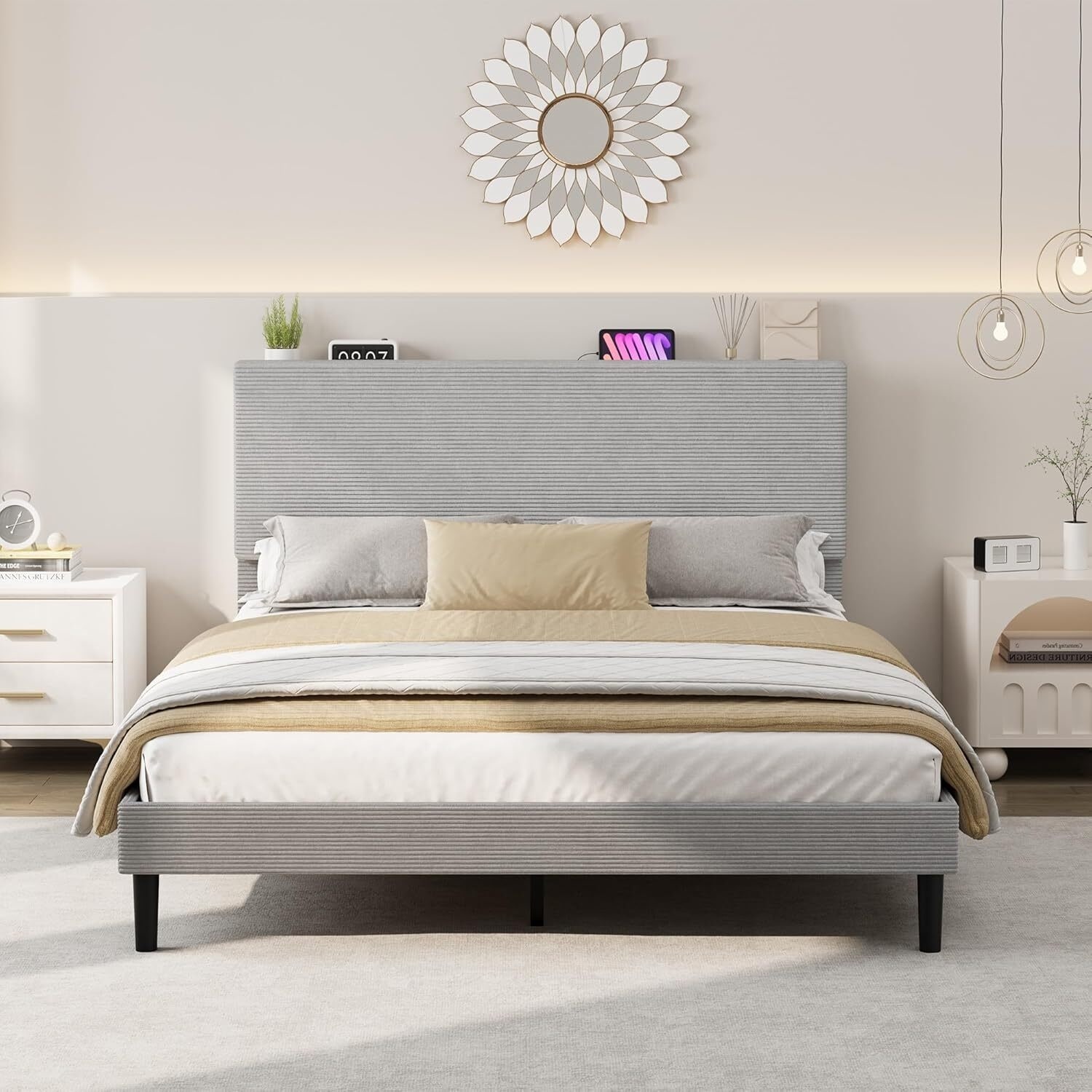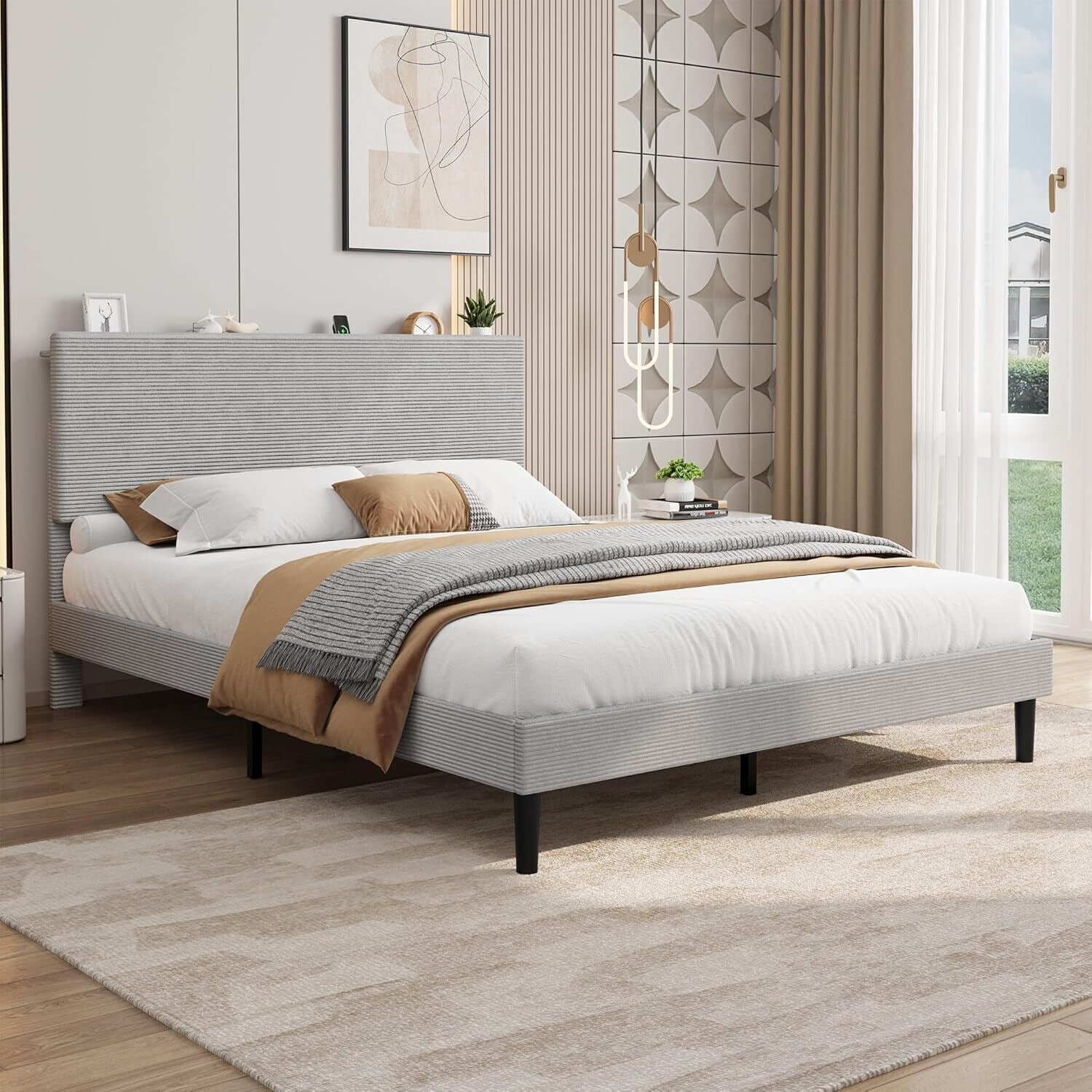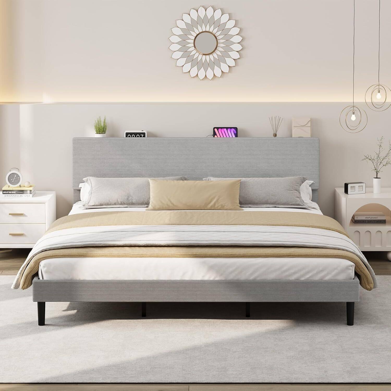 Corduroy Upholstered Platform Bed Frame with Charging Station Headboard, Grey
