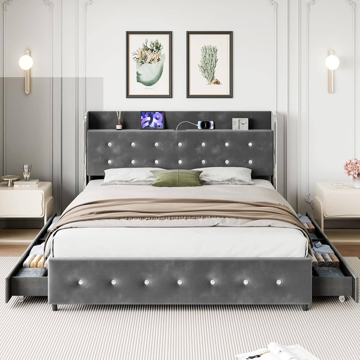 Queen Upholstered Bed with 4 Storage Drawers, Gray