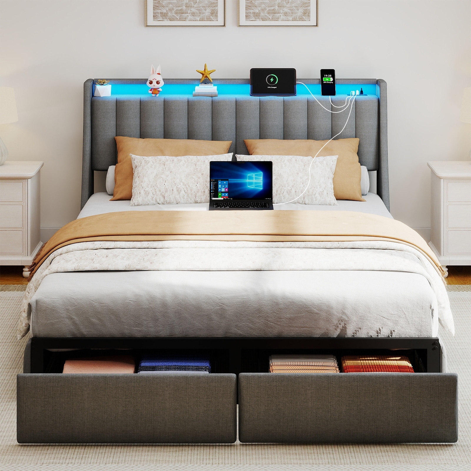 Full Size Upholstered Storage Bed Frame with RGB LED Lights and Charging Station