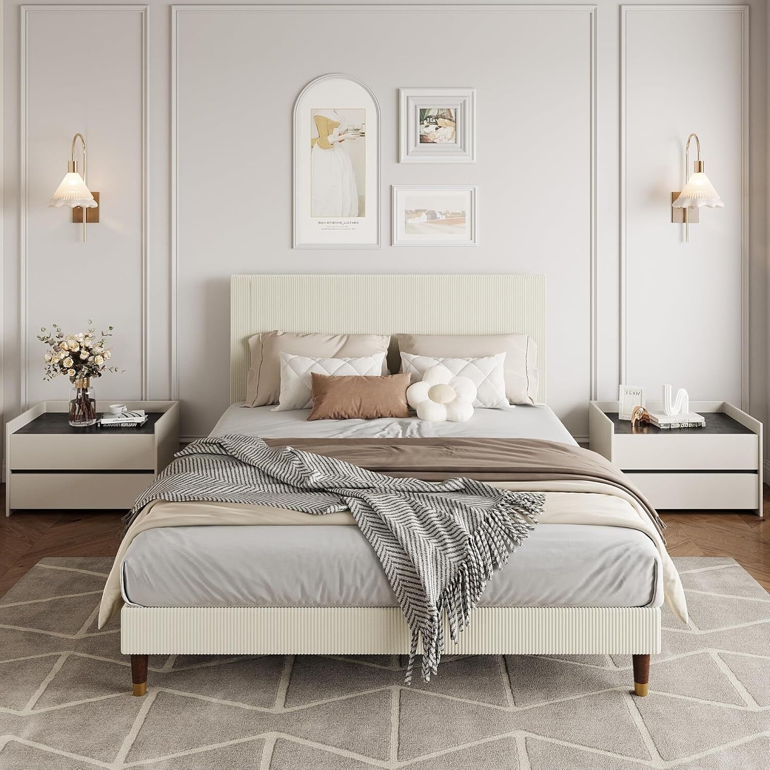 Soft Corduroy Fabric Platform Bed Frame with Upholstered Headboard, White