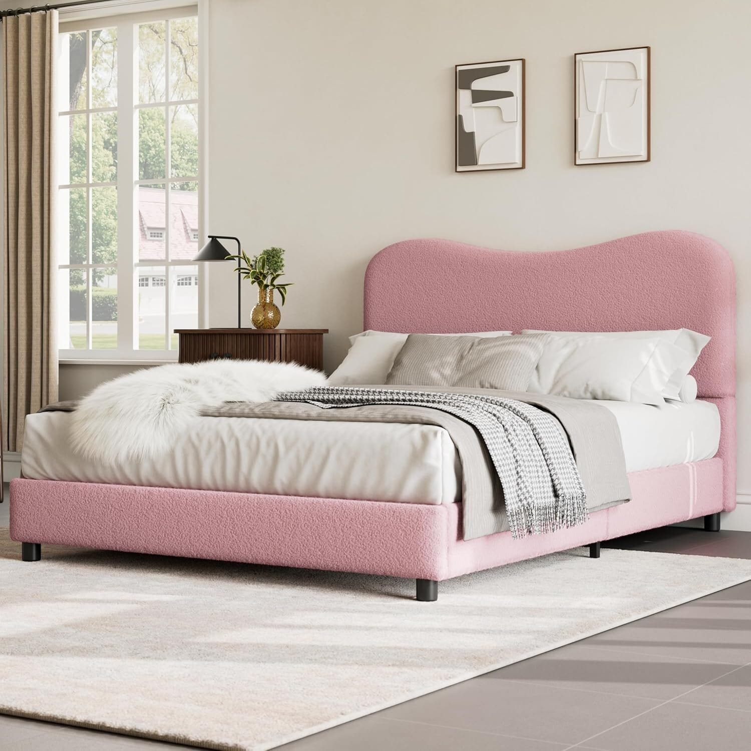 Upholstered Boucle Bed Frame with Headboard, No Box Spring Needed, Pink