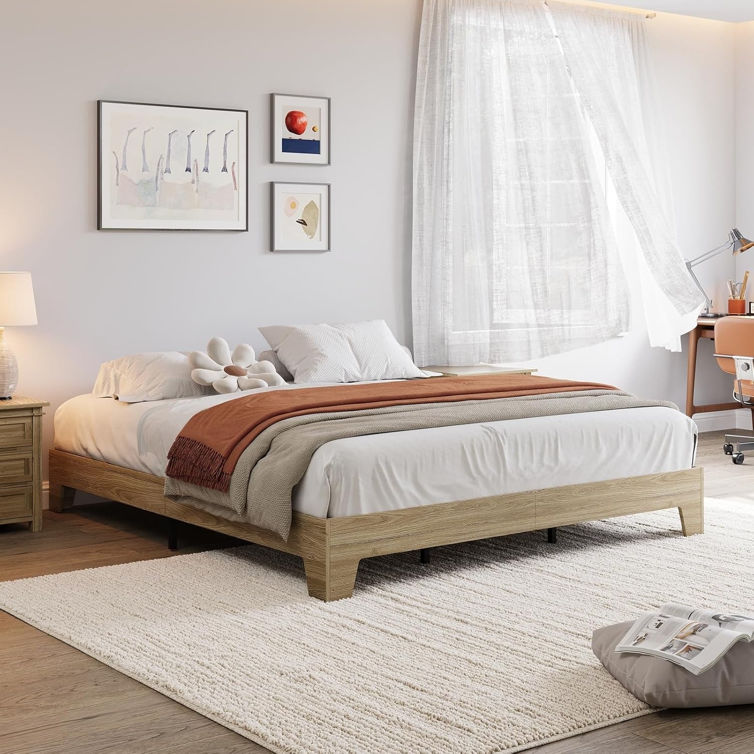 Solid Wood Platform Bed with Sturdy Wooden Slats Floor-Standing Bed Frame Modern Minimalist Design Space-Savin