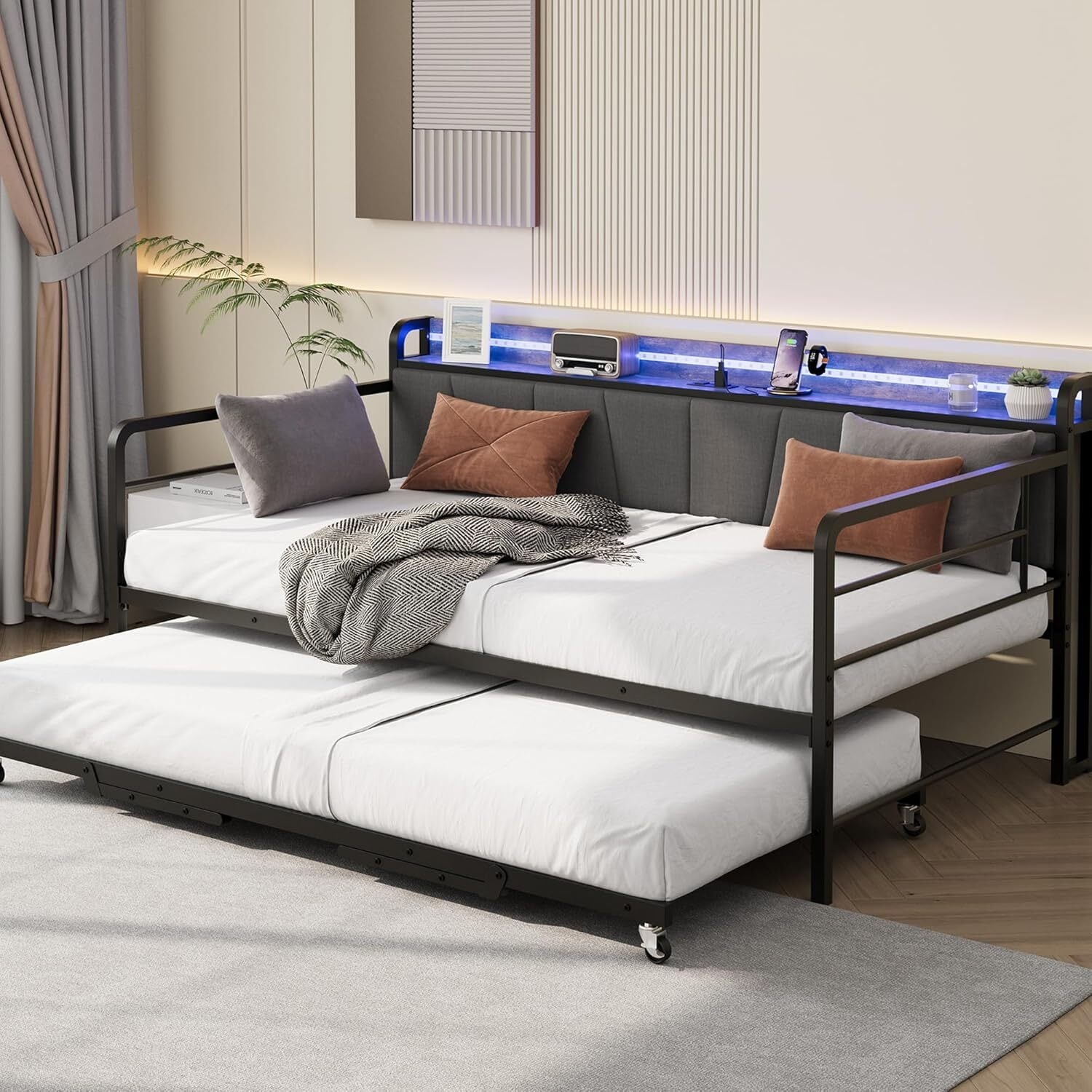 Twin Daybed Frame with LED Lights Charging Station Storage Headboard, Pop Up Trundle