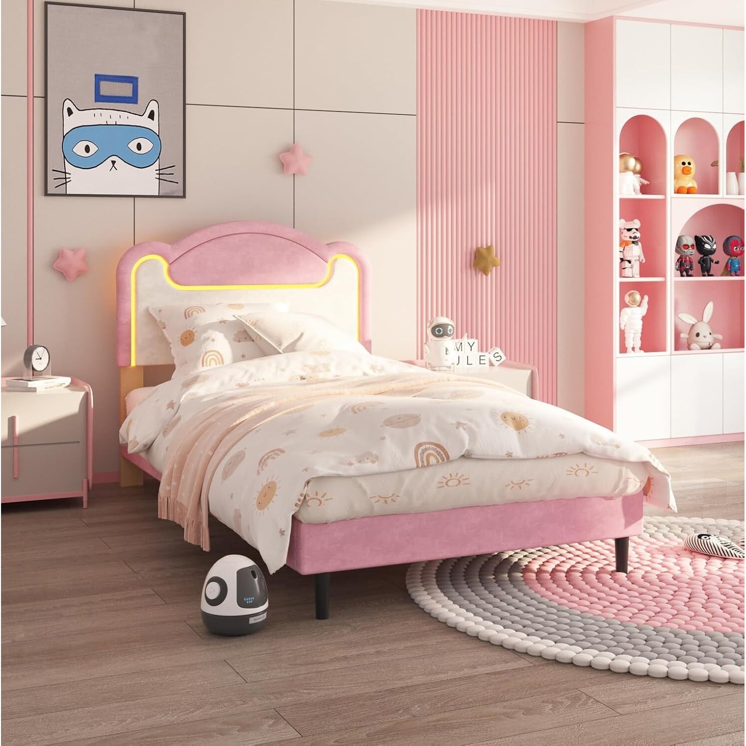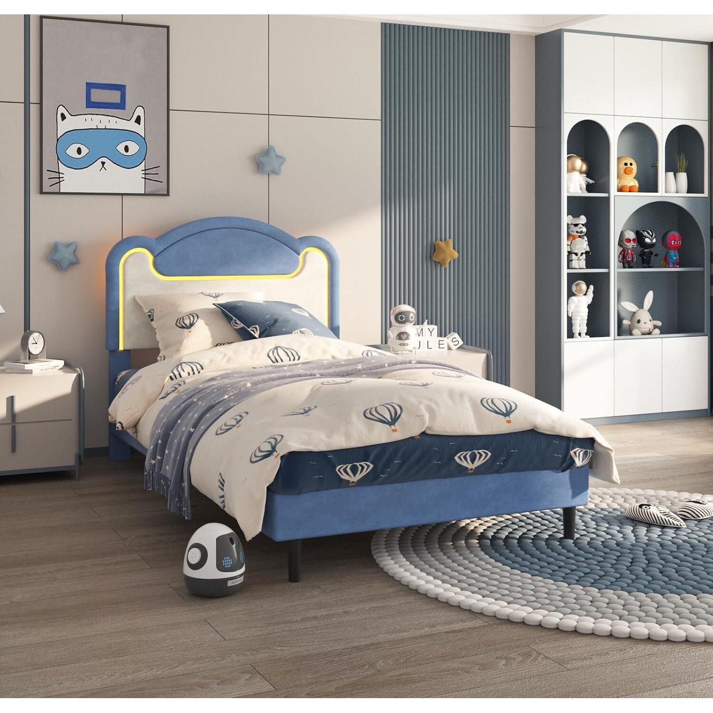 Twin Size Upholstered Fabric Headboard Platform Bed Frame with LED Lights