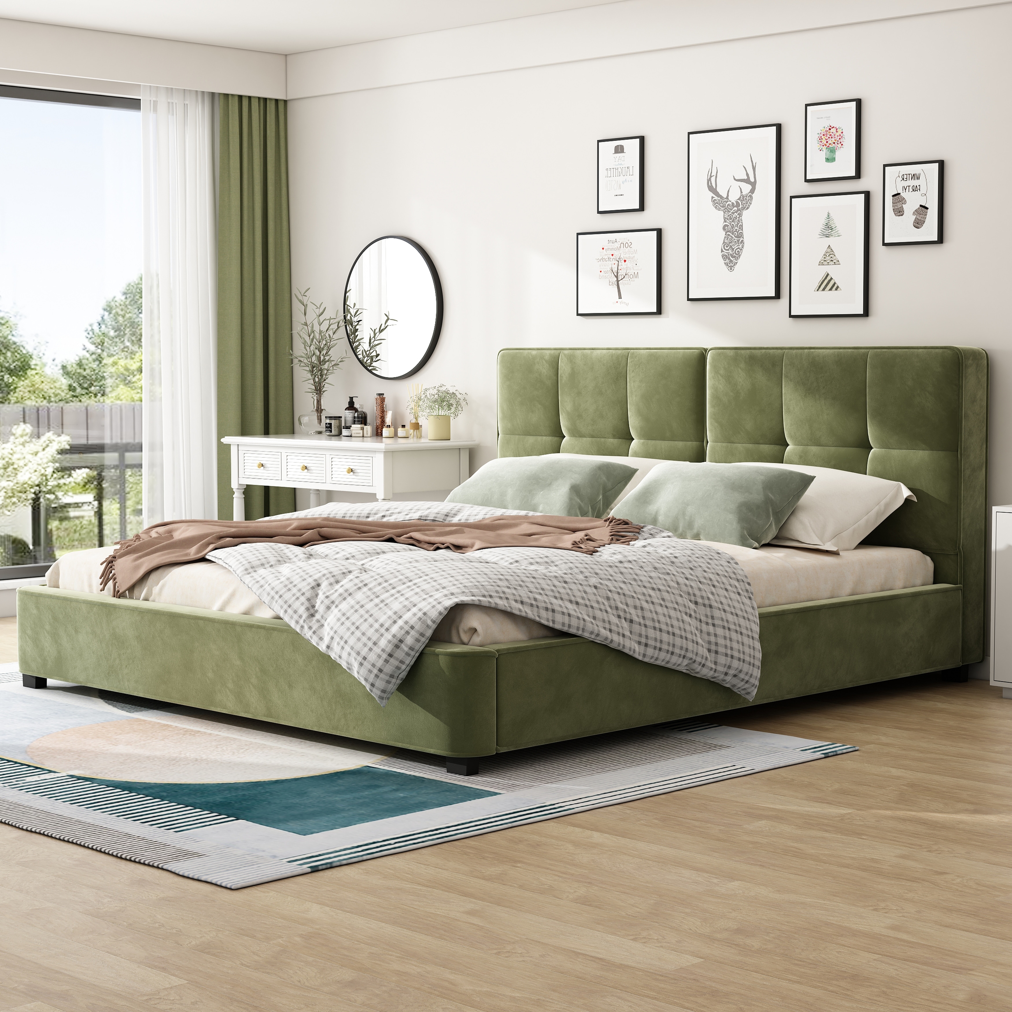 Roomfitters King Size Velvet Upholstered Platform Bed Frame with Tufted Curved Headboard, Olive Green