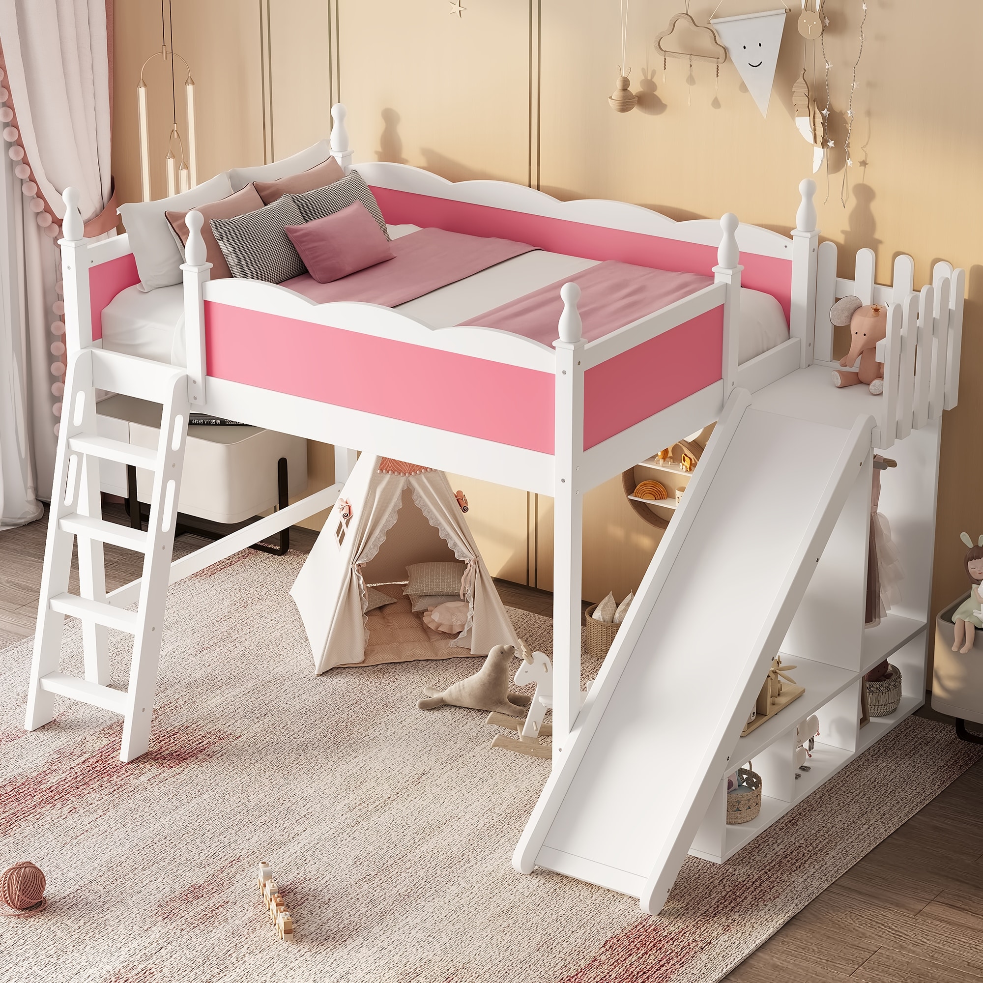 Full Loft Bed with Storage Shelves and Wardrobe, Solid Wood Loft Beds with Detachable Slide and Ladders, No Spring Box Needed