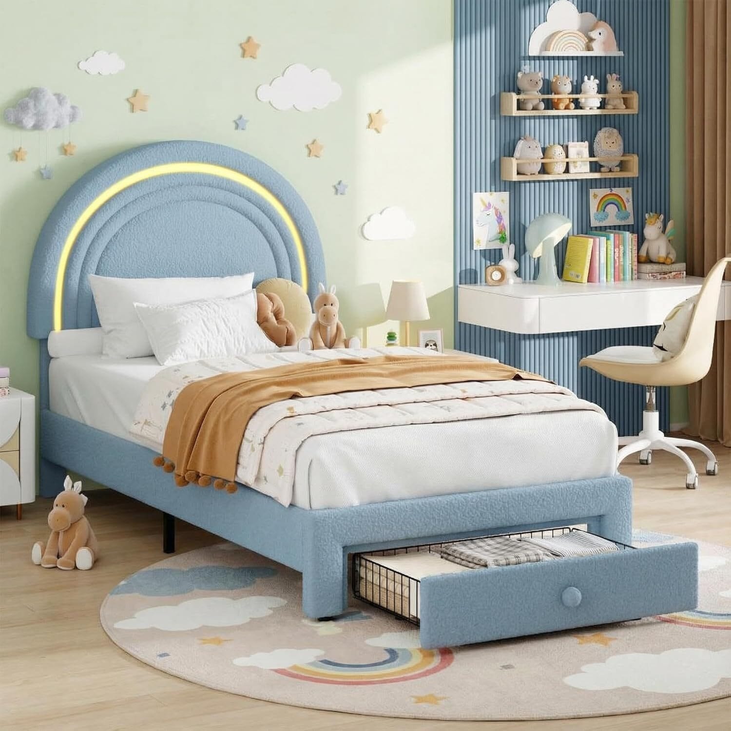 Twin Upholstered Platform Kids Bed Frame with Rainbow Headboard & Storage Drawer