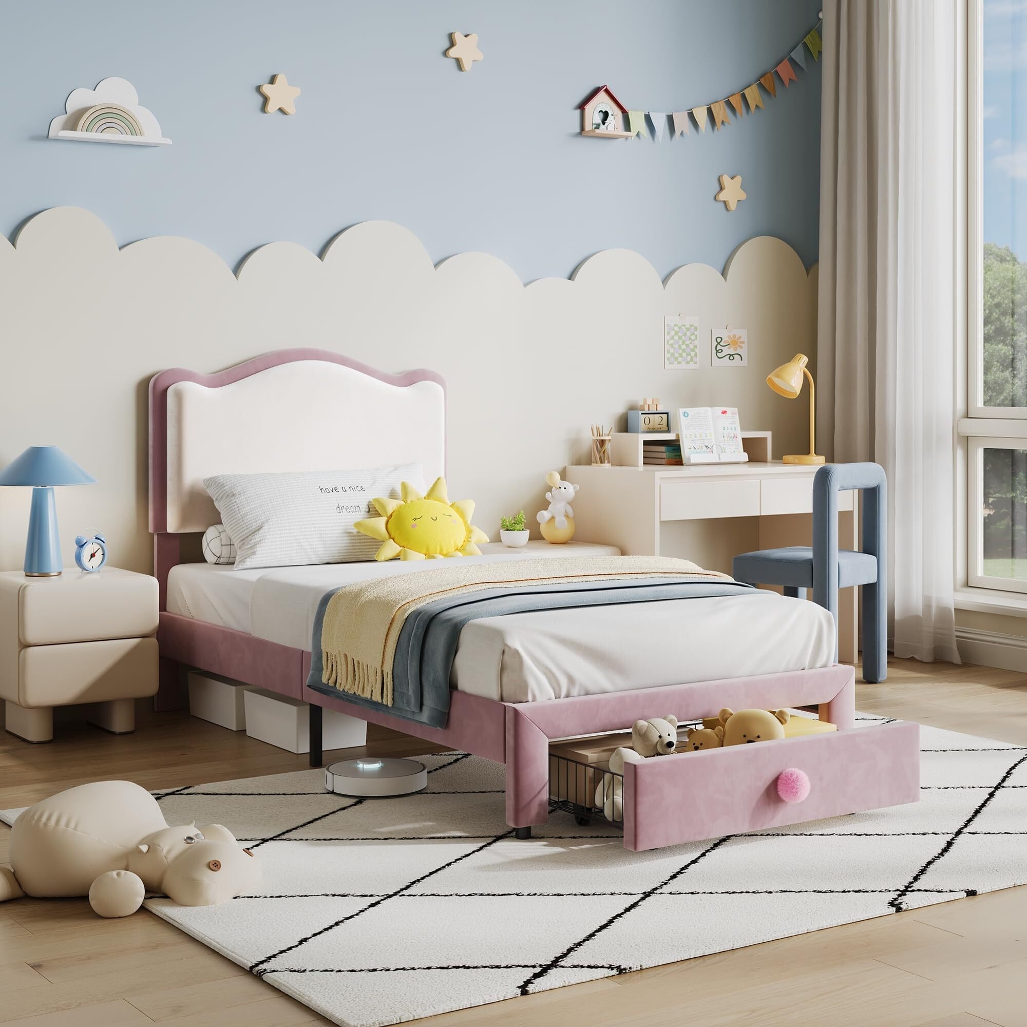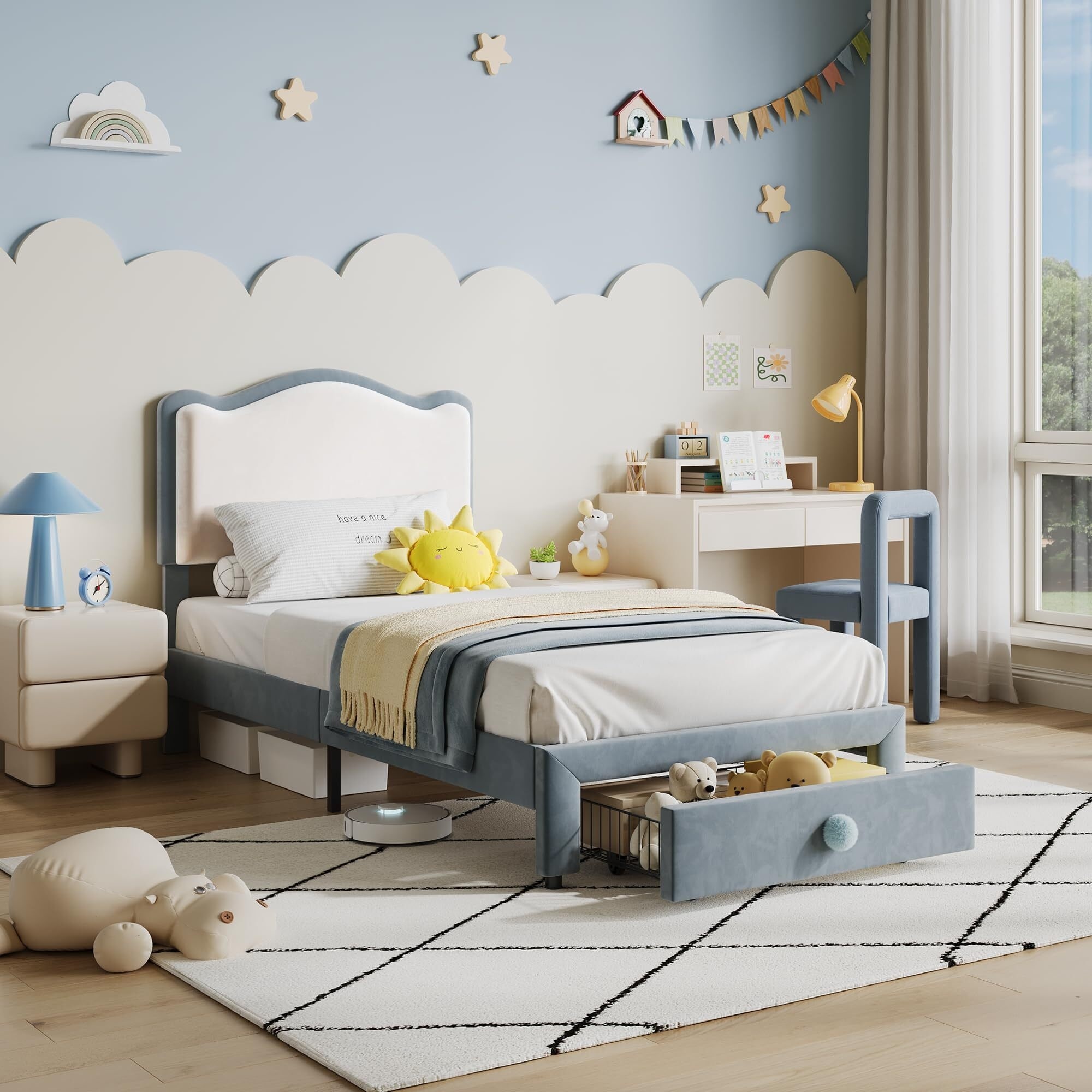 Kids Twin Size Upholstered Bed Frame with Scallop Headboard & Storage Drawer