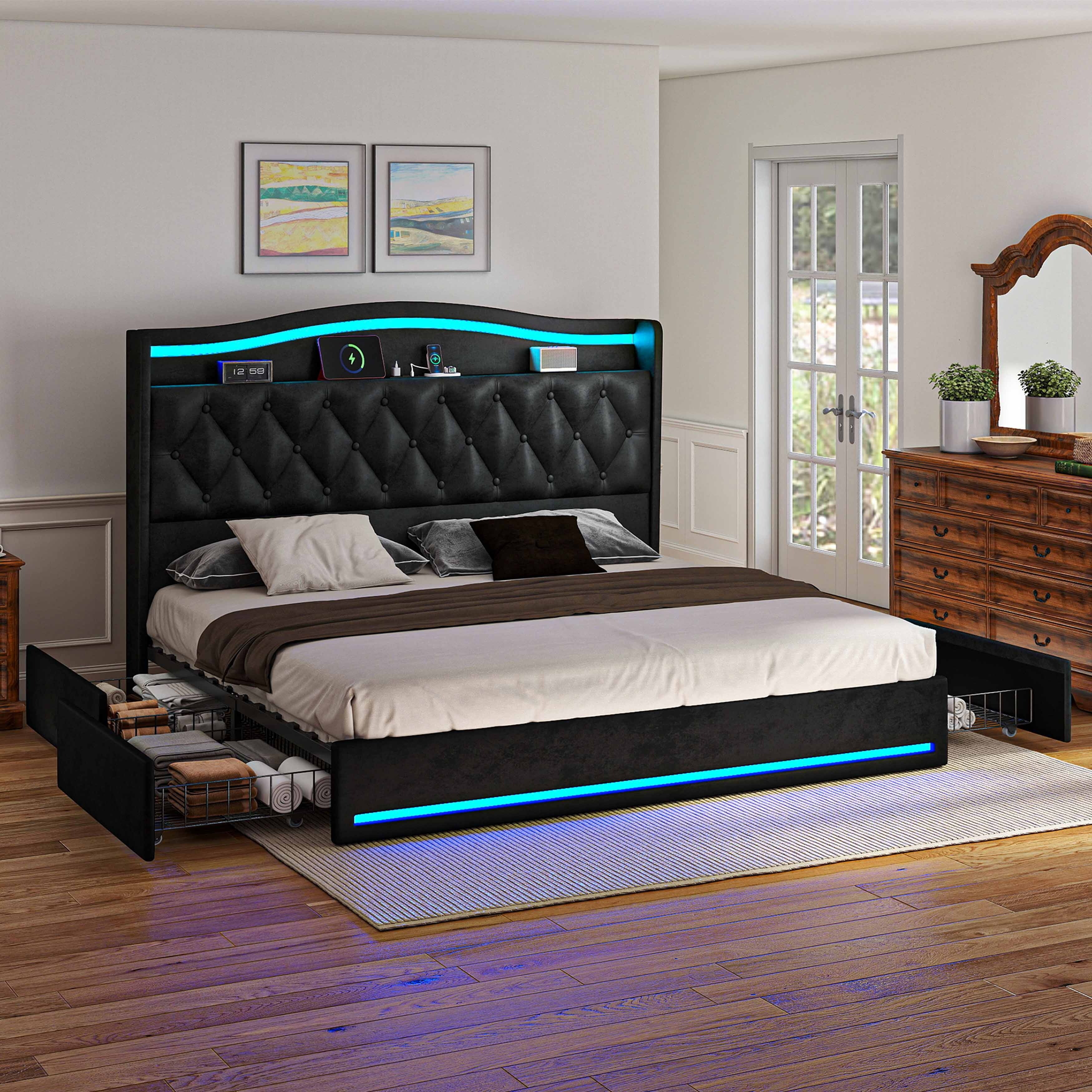 Moasis Queen Size Velvet Upholstered Bed Frame with 4 Storage Drawers & RGB Lights