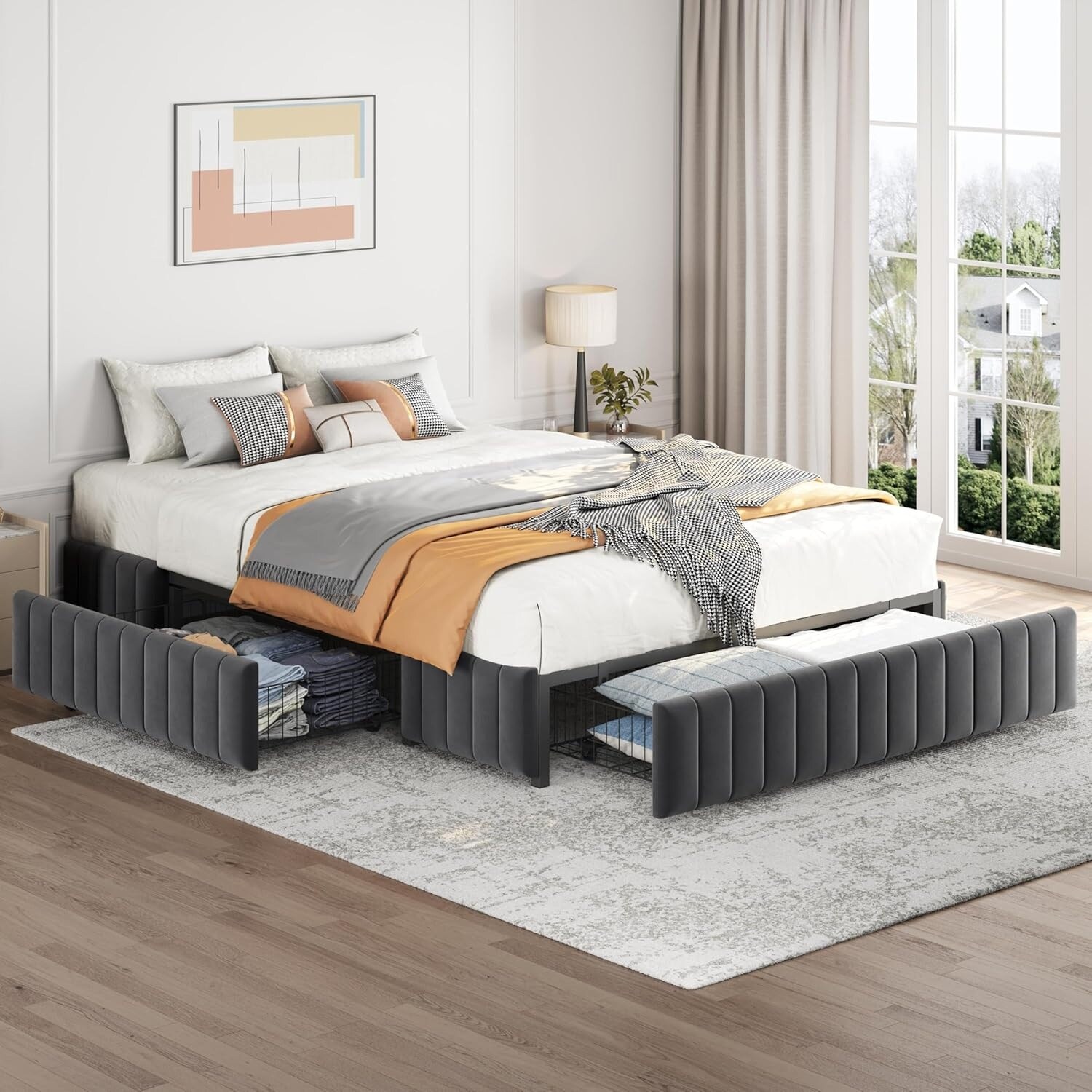 Full Upholstered Platform Bed with 3 Storage Drawers, Wooden Slats Support, No Headboard, Dark Gray