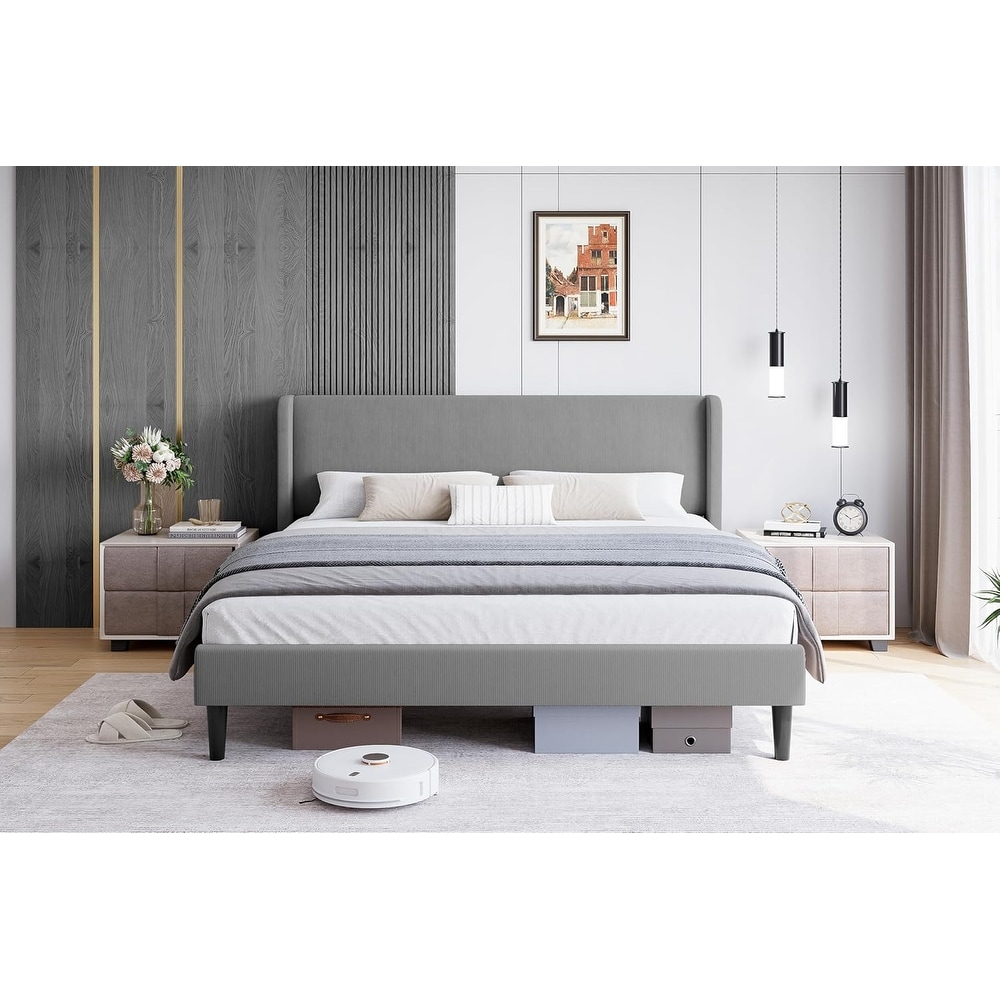 Queen Size Bed Frame with Upholstered Headboard, Wooden Platform, Storage Pockets, Noise-Free, Light Gray