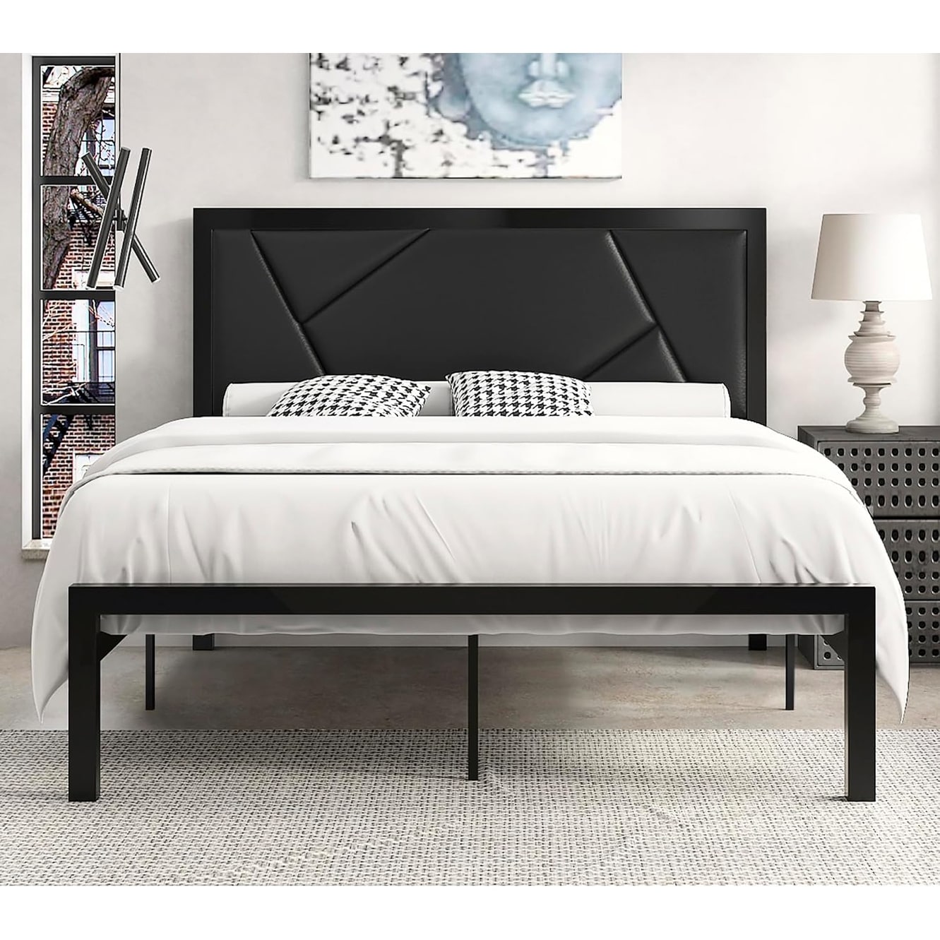 Full Size Metal Bed Frame with Leather Headboard, Geometric Design, Heavy Duty Slats, No Box Spring Needed, Black