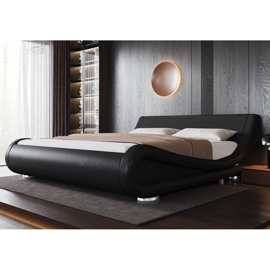 Queen Size Bed Frame with Adjustable Headboard, Upholstered Platform Sleigh Design, Black