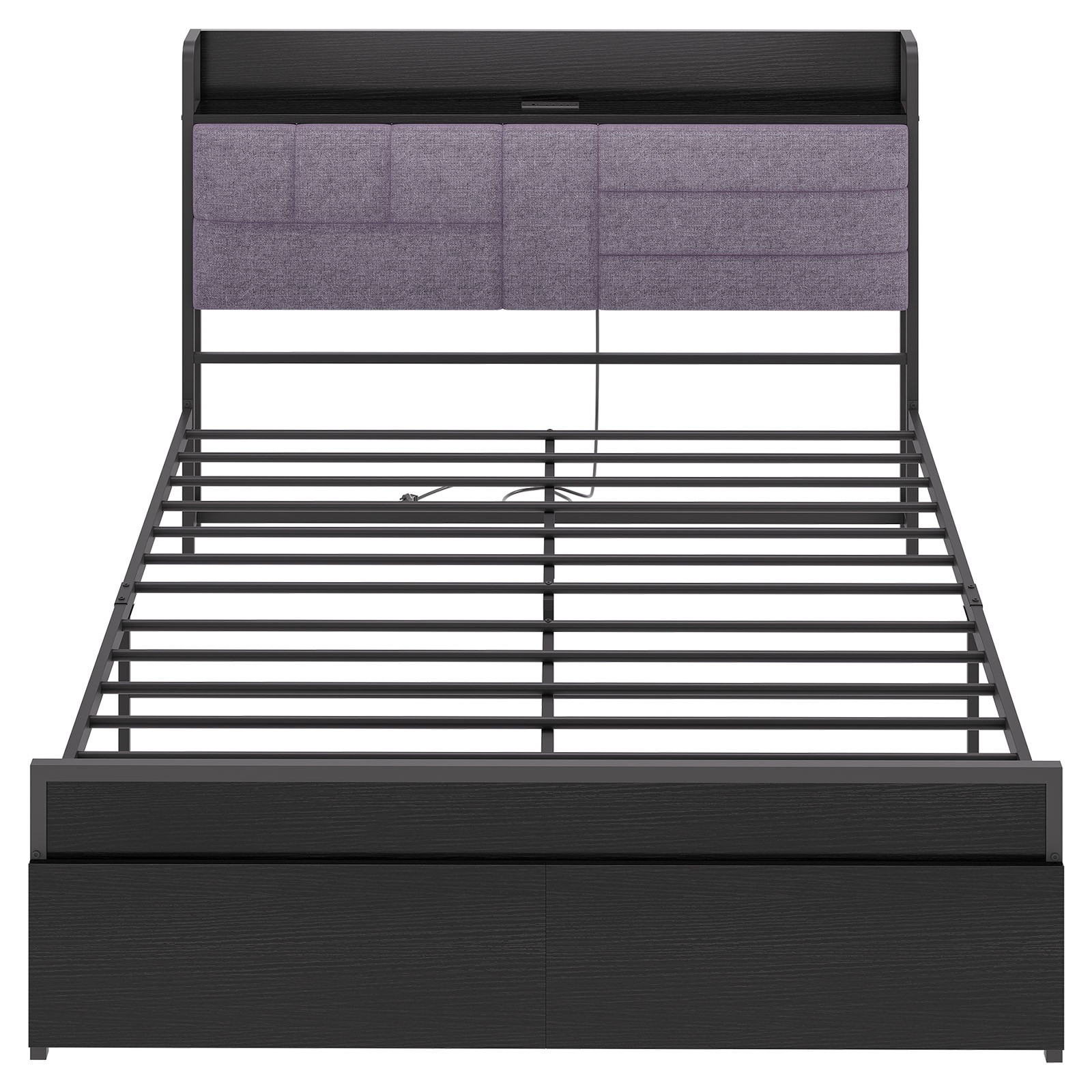 Full Bed Frame with Grey Headboard, Storage & Charging Station, No Box Spring