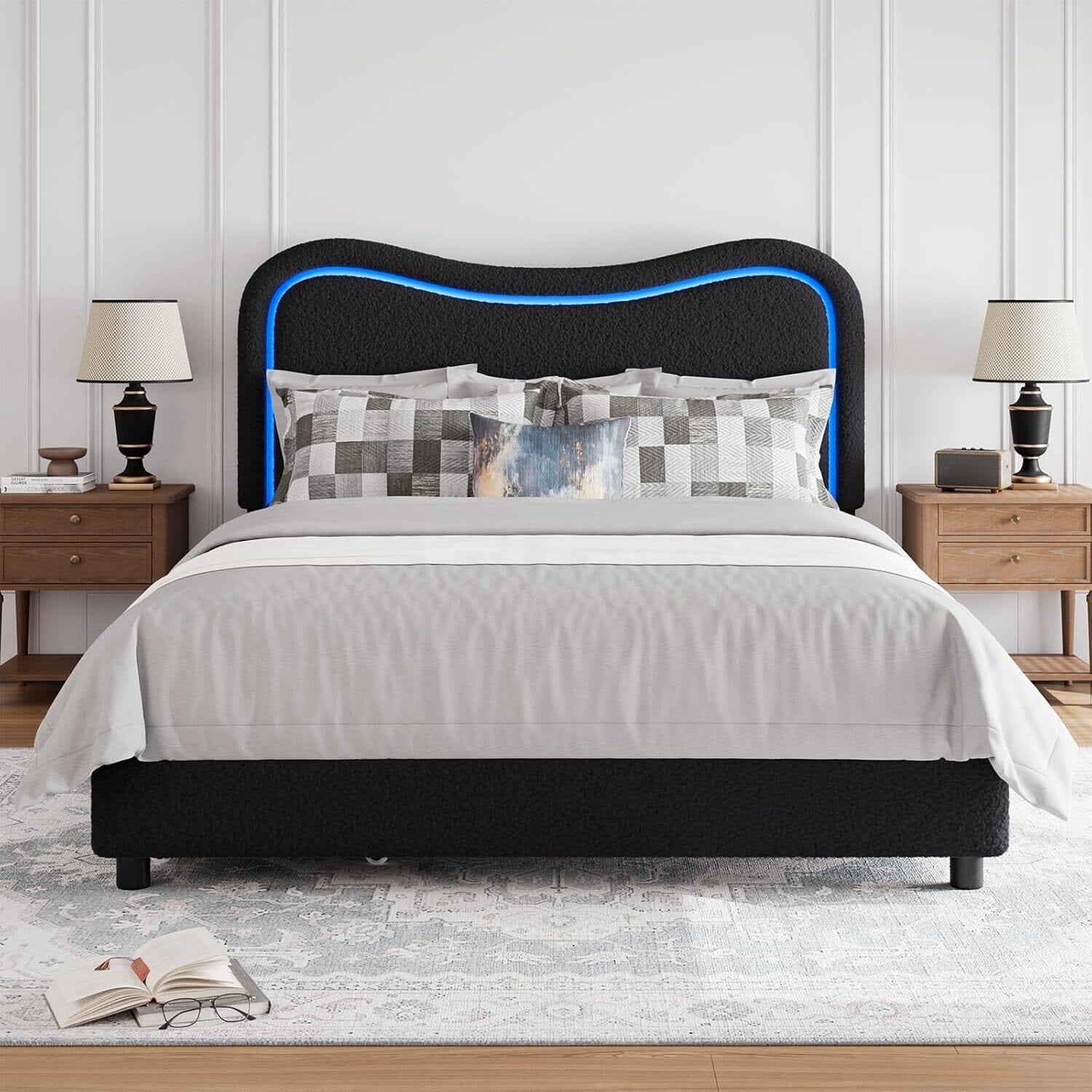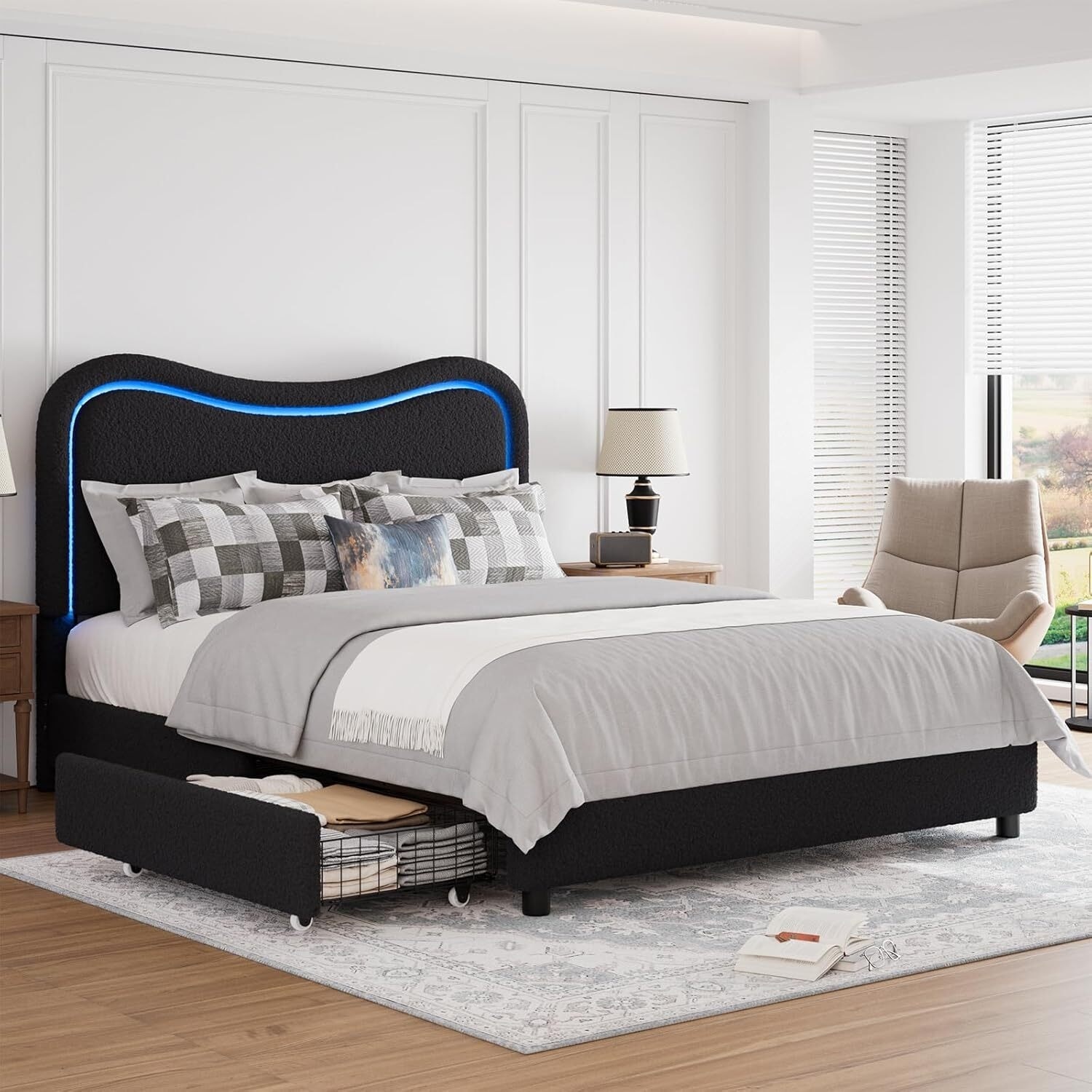 Teddy Upholstered Boucle Platform Bed Frame with 2 Storage Drawers and LED Lights, Black