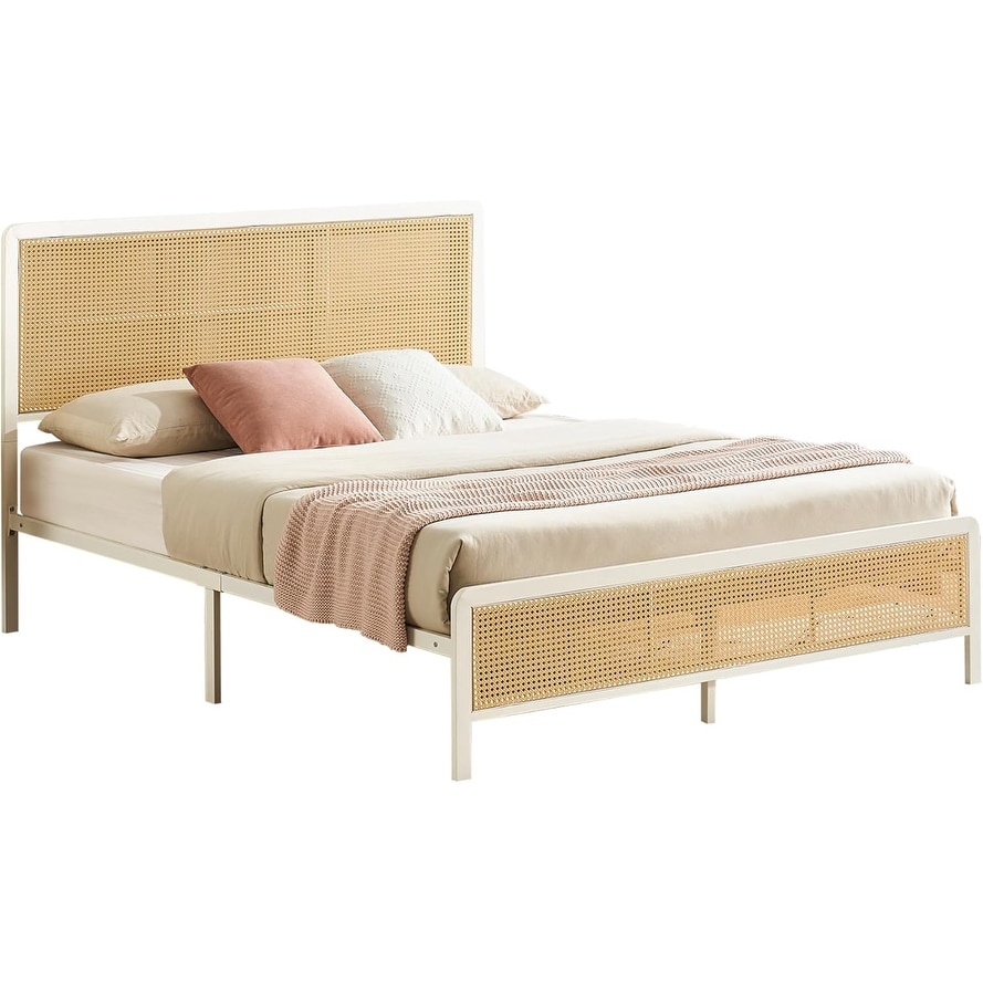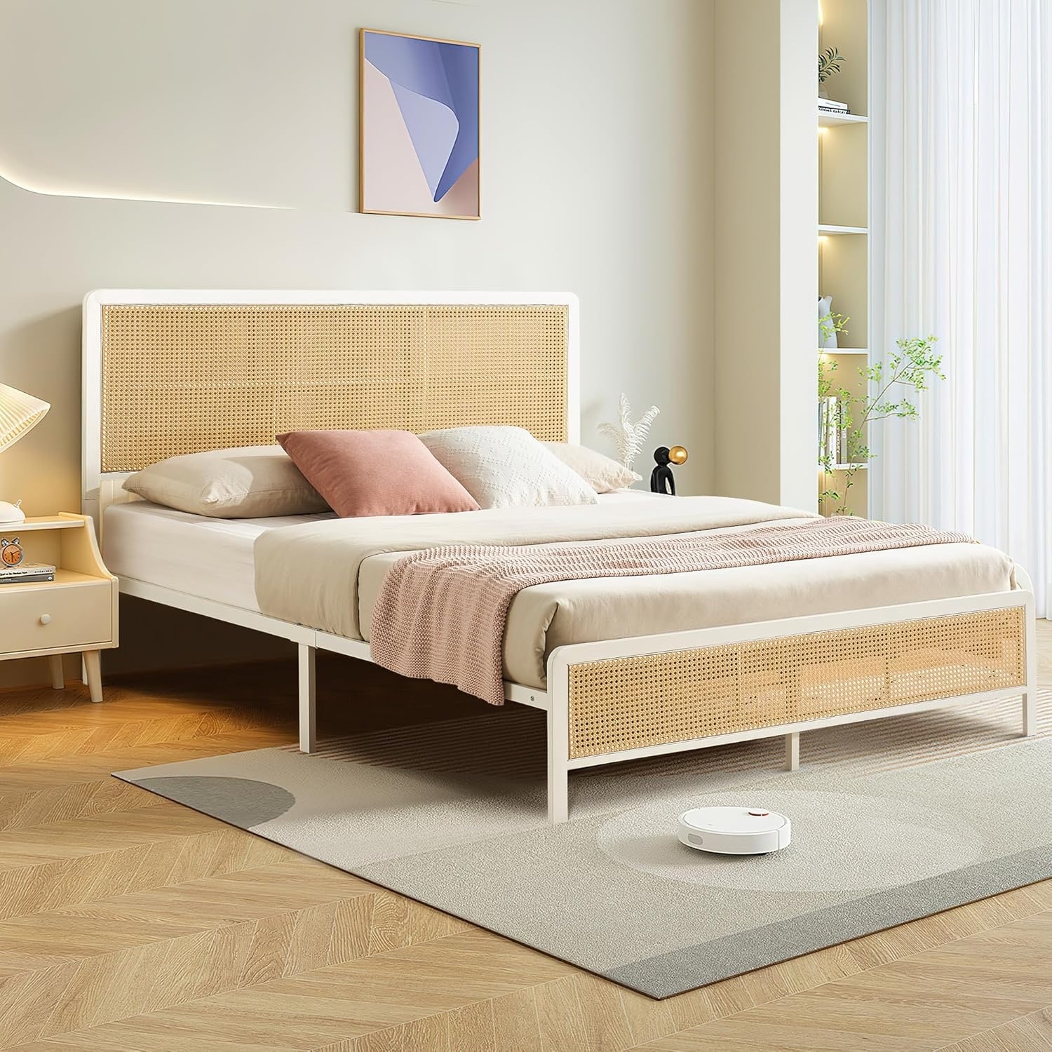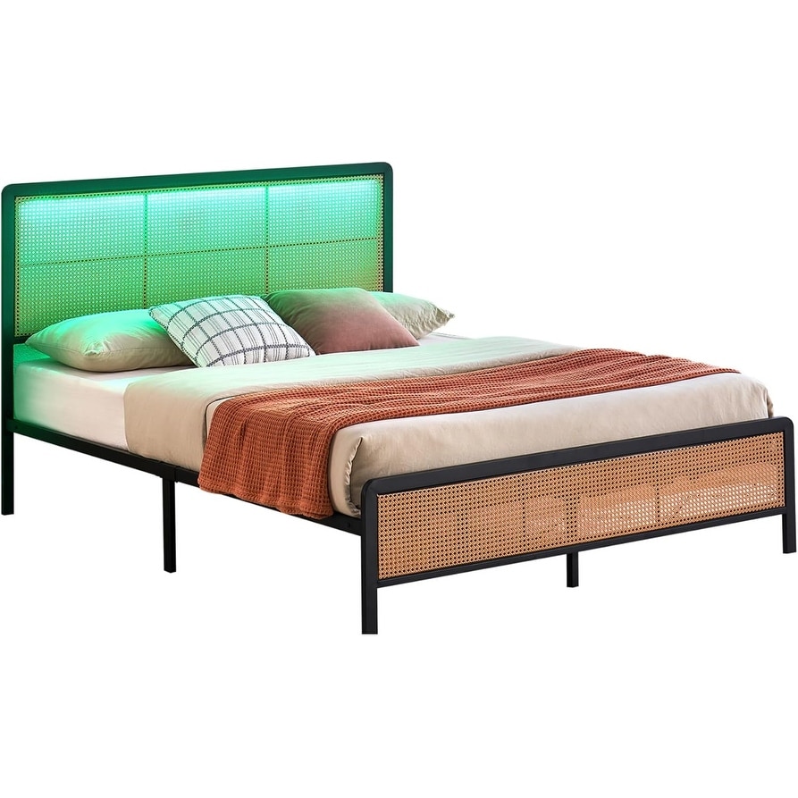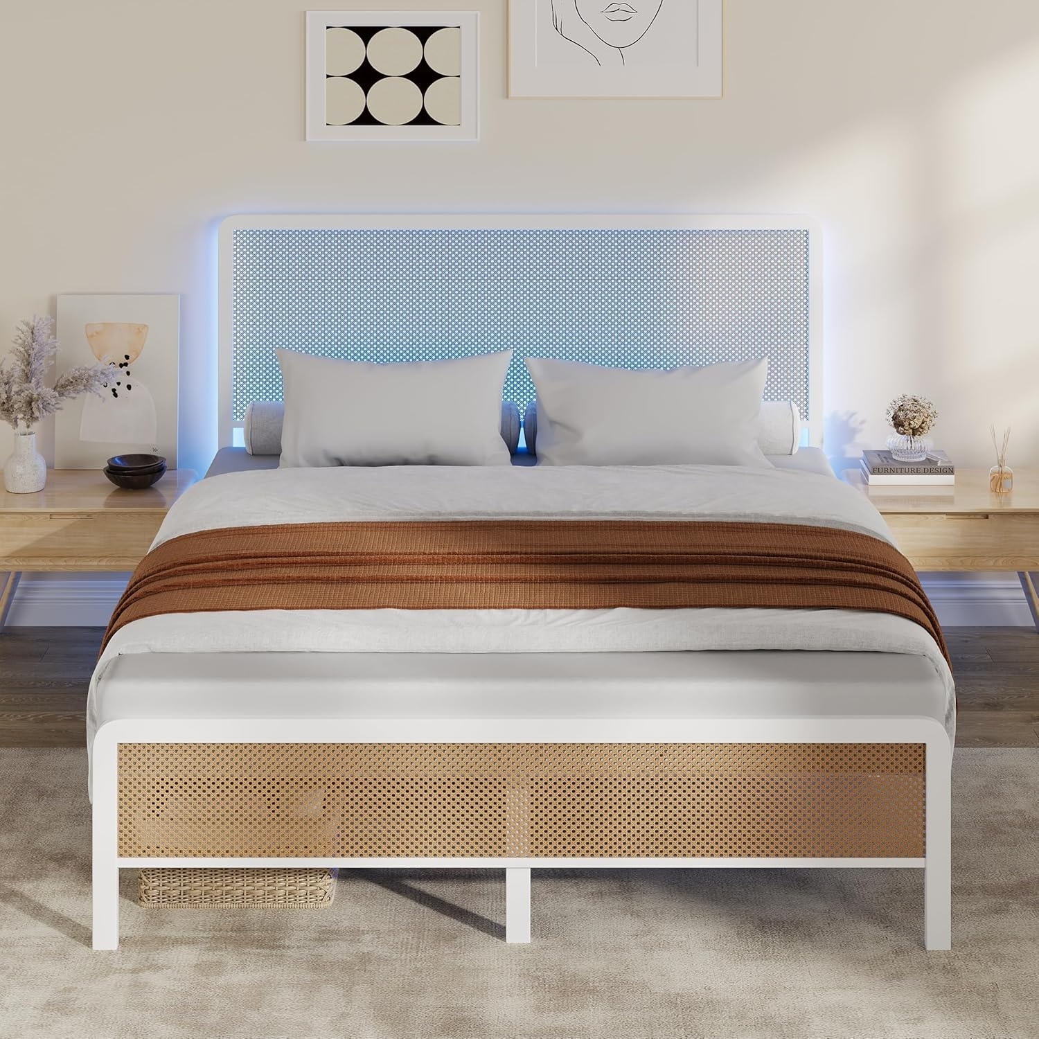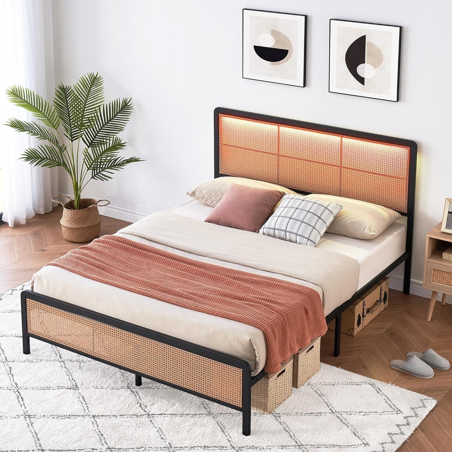 Bed Frame with Rattan Headboard, Metal Slats Support, LED Headboard, Noise Free, Easy Assembly